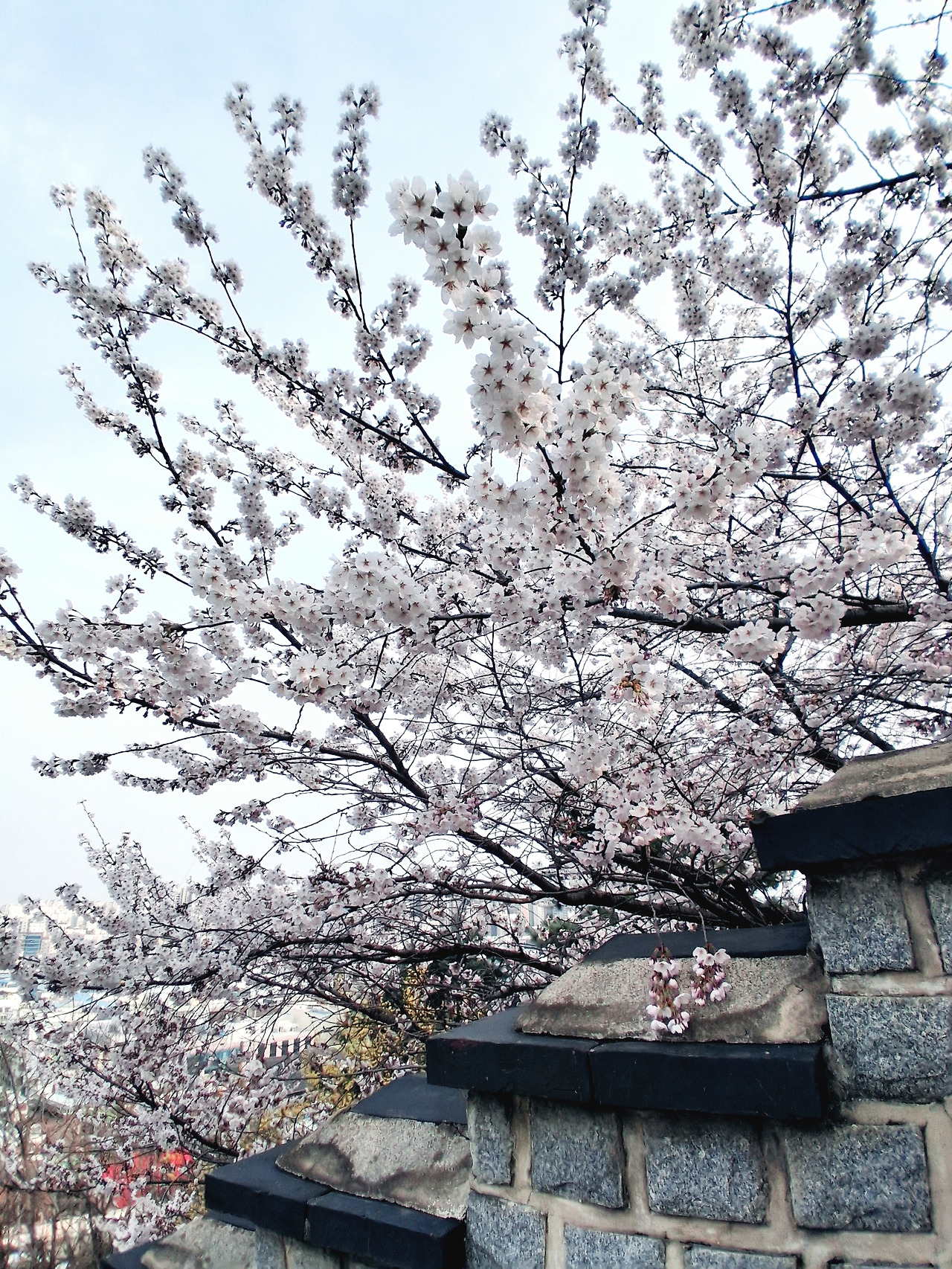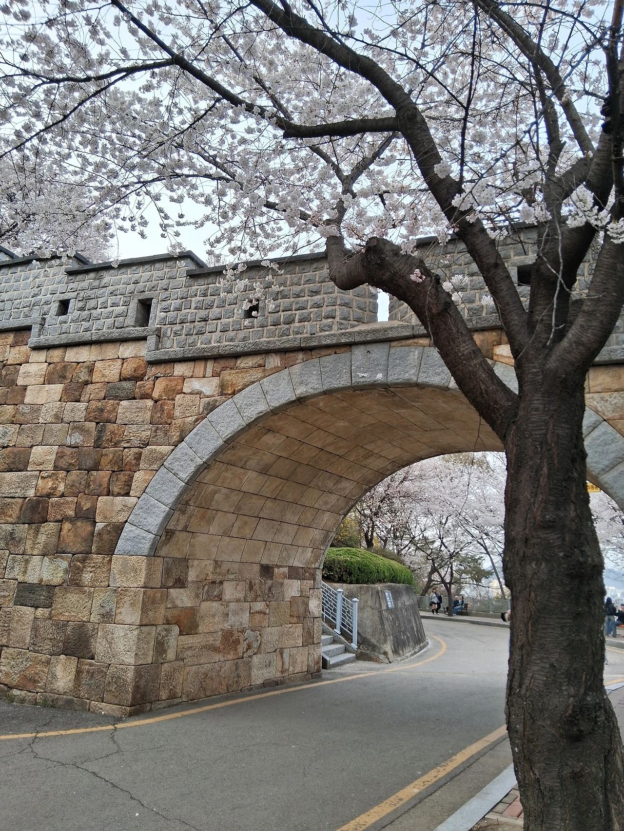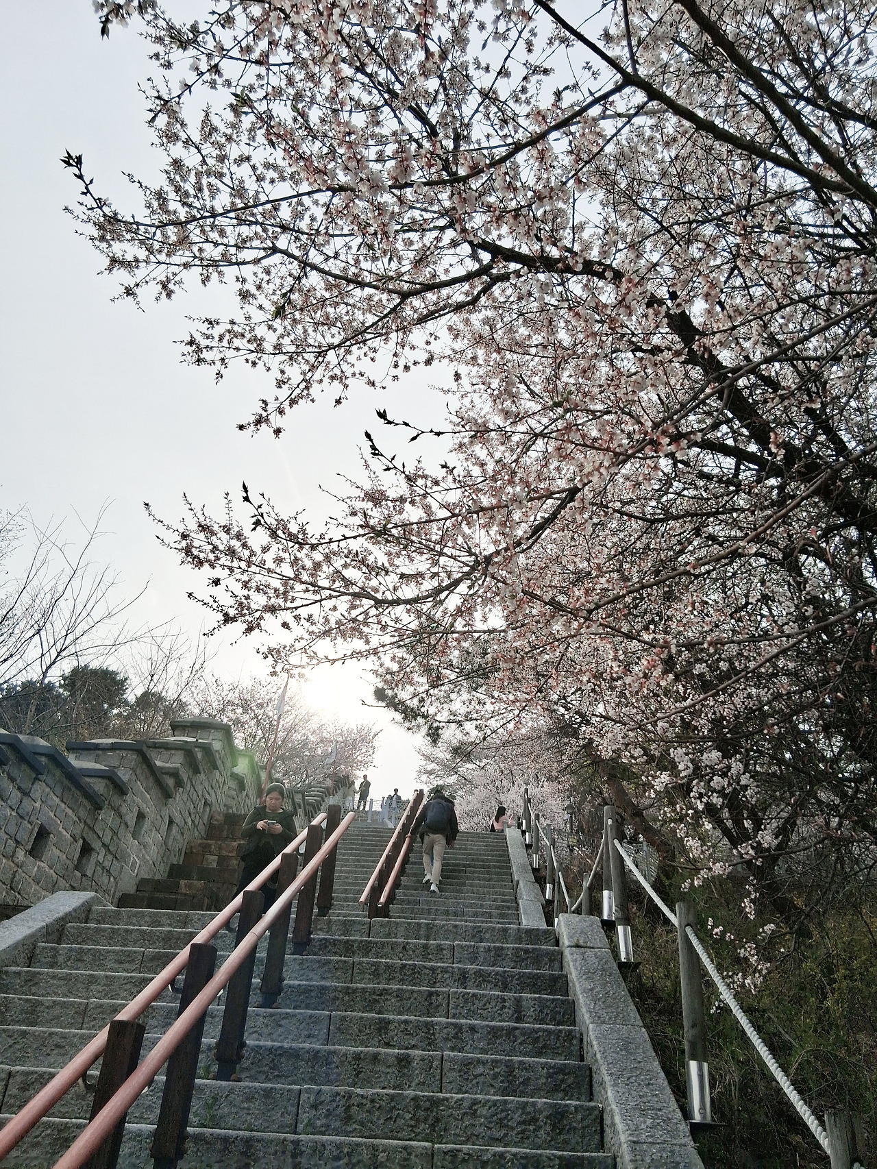 이런저런 이유로 팔달문(남문)에서 시작해서 수원화성 성곽길 가파른 돌계단을 올라가 팔달산 벚꽃길로 간다. 벚꽃 보러 온 사람들은 그리 많지도 적지도 않고 적당하다. 벚꽃 명소에 가보면 완전 사람을 보러 온 건지 벚꽃을 보러 온 건지 헷갈릴 때가 있다. 그런데 이곳 수원 팔달산 벚꽃길은 그러지 않아서 좋다. 물론 주말이 아니고 평일에 왔기 때문일 지도 모른다.