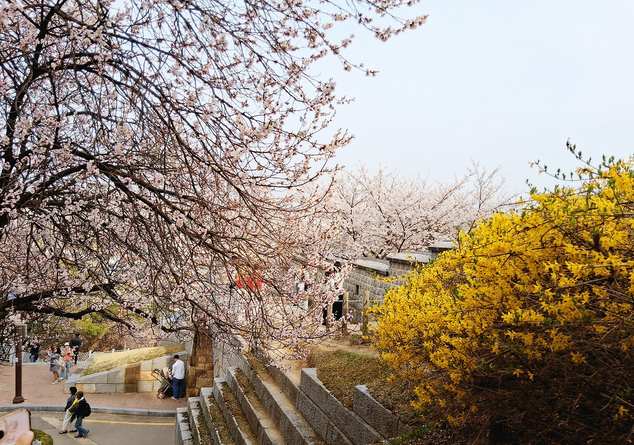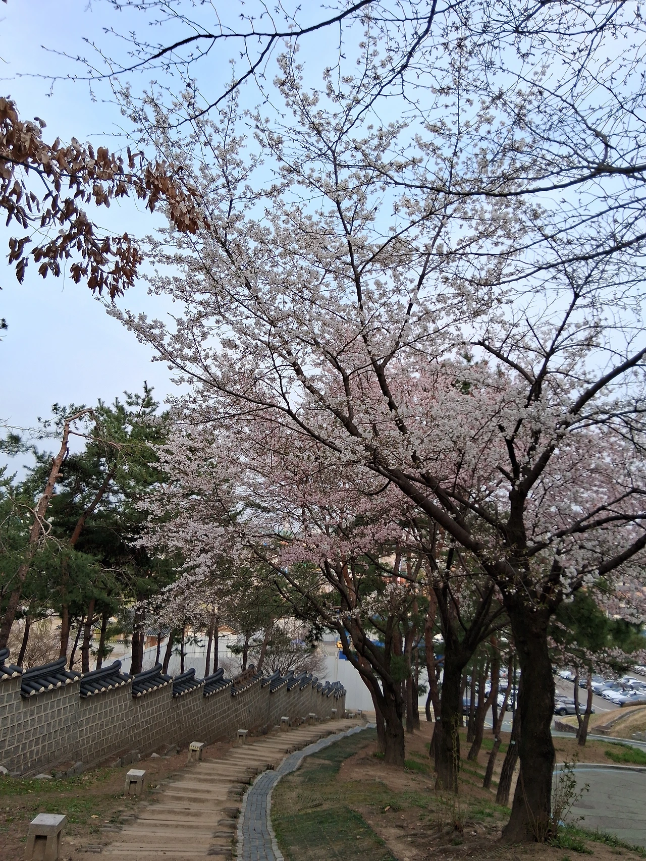 봄꽃 실컷 보고는 수원화성행궁 쪽으로 내려갈 것이다. 이따 저녁 7시에 수원미디어센터에서 영화를 볼 예정이라서다. 시간은 넉넉하다. 수원화성성곽길과 팔달산 벚꽃길 걷고 저녁도 먹고 영화를 보러 가려고 집에서 오후 3시에 나왔기 때문이다. 수원화성 성곽길은 천천히 한 바퀴를 다 돌아도 2시간 30분 정도면 가능한데, 나는 오늘 이쪽 벚꽃길만 걸을 거라서 여유가 있다.