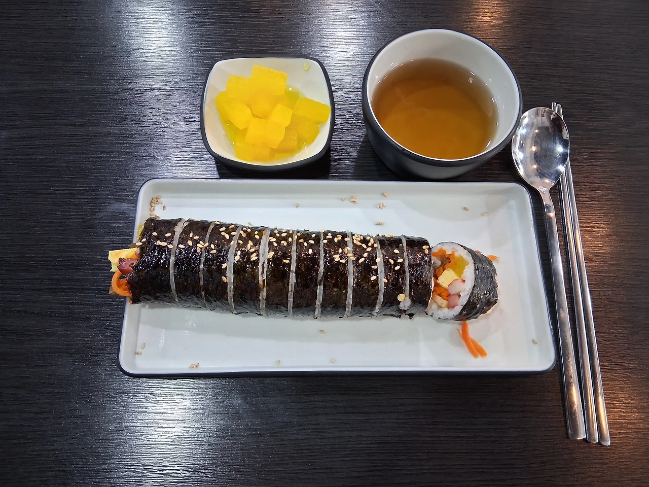 그런데 수원미디어센터 근처에서 늘 저녁을 먹던 단골 <할머니집>이 장소를 남문 근처로 옮겼단다. 그 근처에 식사할 곳은 마땅치가 않다. <이설옥>은 여름에 와서 냉면을 먹어야 제맛이고, 새로 생긴 <설렁탕> 집은 안 들어가고 싶다. 할 수 없이 화성행궁 네거리 쪽으로 다시 걸어 나오지만 눈에 띄는 집이 없다. 중국집은 엊그제 갔고, 분식집이 있으면 좋겠는데, 없다. 콩국을 주로 해서 음식 만드는 집이 궁금했는데 그냥 지나쳤다. 수원통닭거리 쪽으로 가니 분식집 하나가 보인다. 들어간다. 전통시장 쪽보다 야채 김밥이 천 원이나 비싸다. 그래도 간단하게 먹을 거라서 괜찮다. 시간은 40여 분 정도 남았다. 천천히 먹고 수원미디어센터로 다시 간다.