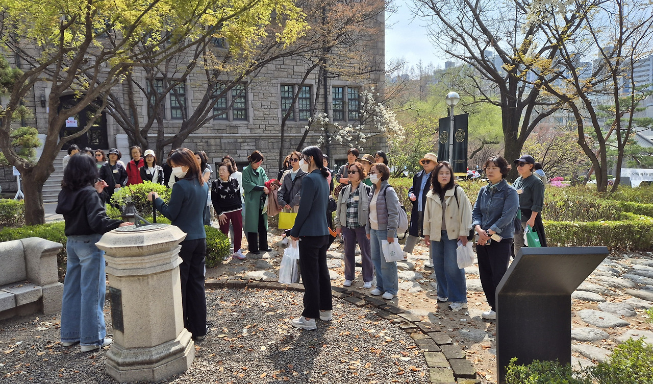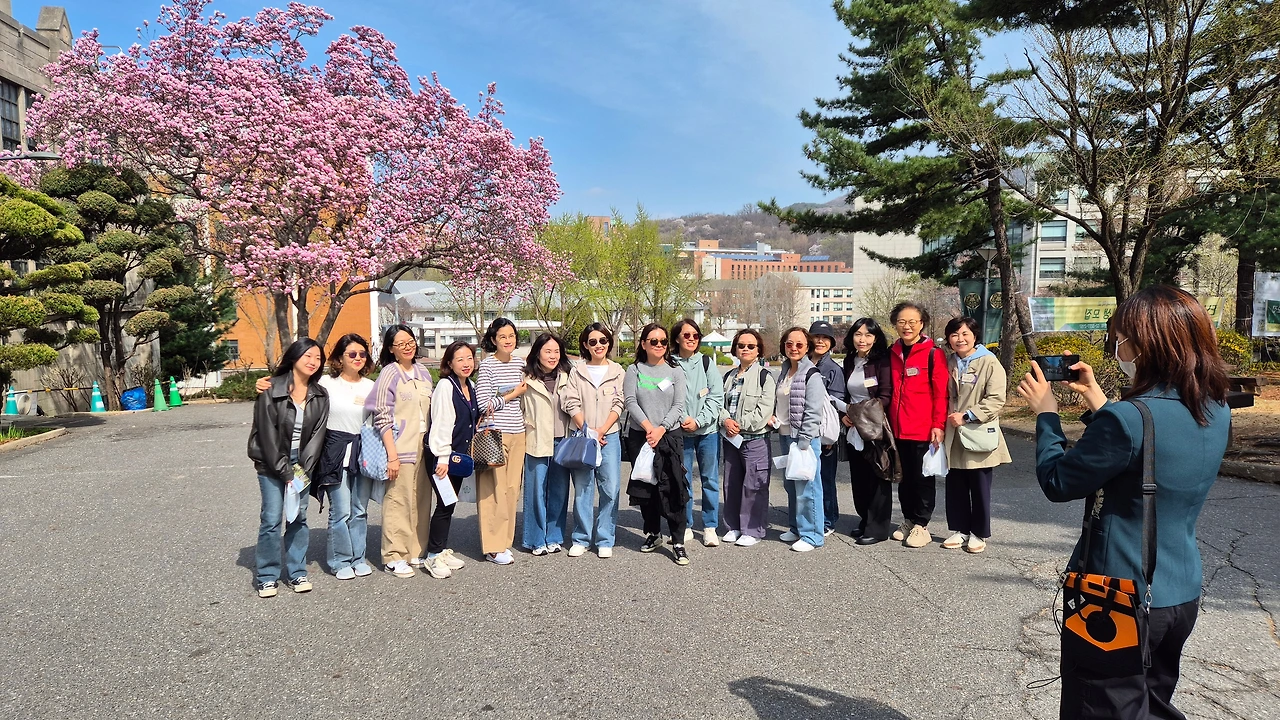 임원진 준비팀은 이화박물관 앞에 현수막을 걸어놓고 명찰을 준비하고 선물도 챙겨두고 있다. 참가자들이 도착하면 바로바로 출석체크를 하고 하나씩 주신다. 오늘의 사진작가 서지희 고문님은 미리 온 사람들은 동기들끼리 사진도 찍어주신다. 시간이 되어 대강당, ECC관을 배경으로 단체사진을 찍고 두 팀으로 나누어 두 명의 이화 재학생 해설사들의 안내로 이화 교정을 돌아본다. 특별히 오늘 단체 사진은 이연주 전 부회장님 따님이 외손녀와 함께 와서 예쁘게 남겨주어서 감사하다.