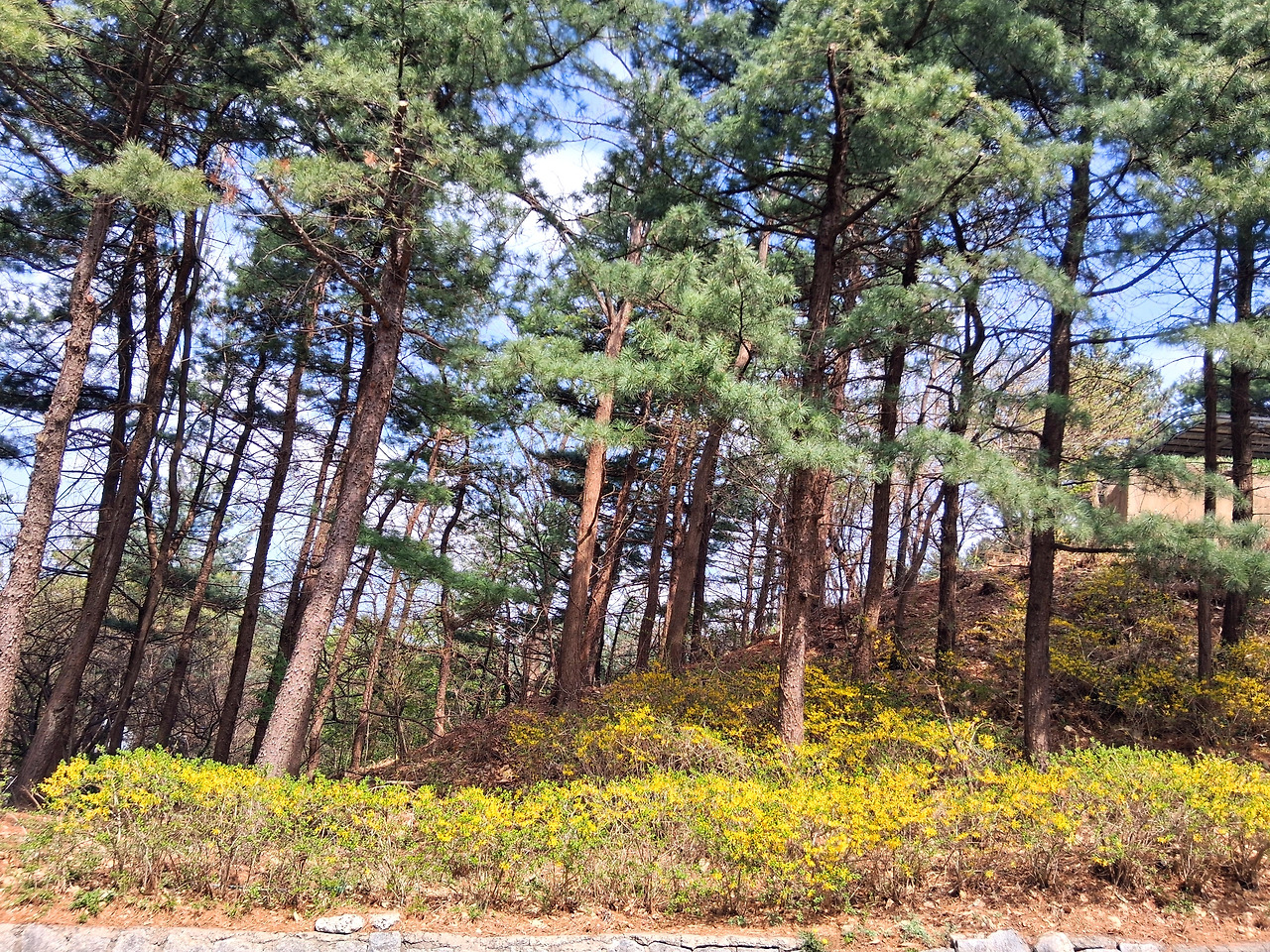 산길 오름길 지나 뒷길에는 개나리가 노랗게 피었다. 도로길 따라 팔복동산으로 간다. 나는 학교 다닐 때 이곳에 한 번 오른 적이 있다. 기억이 조금 가물거리지만 아마도 안산에 갔다가 이 도로길을 따라 이화로 내려올 때 지나왔던 것 같다.