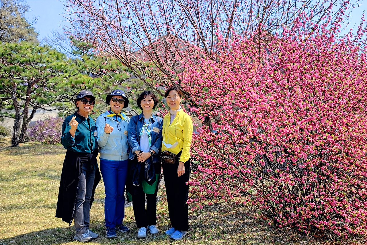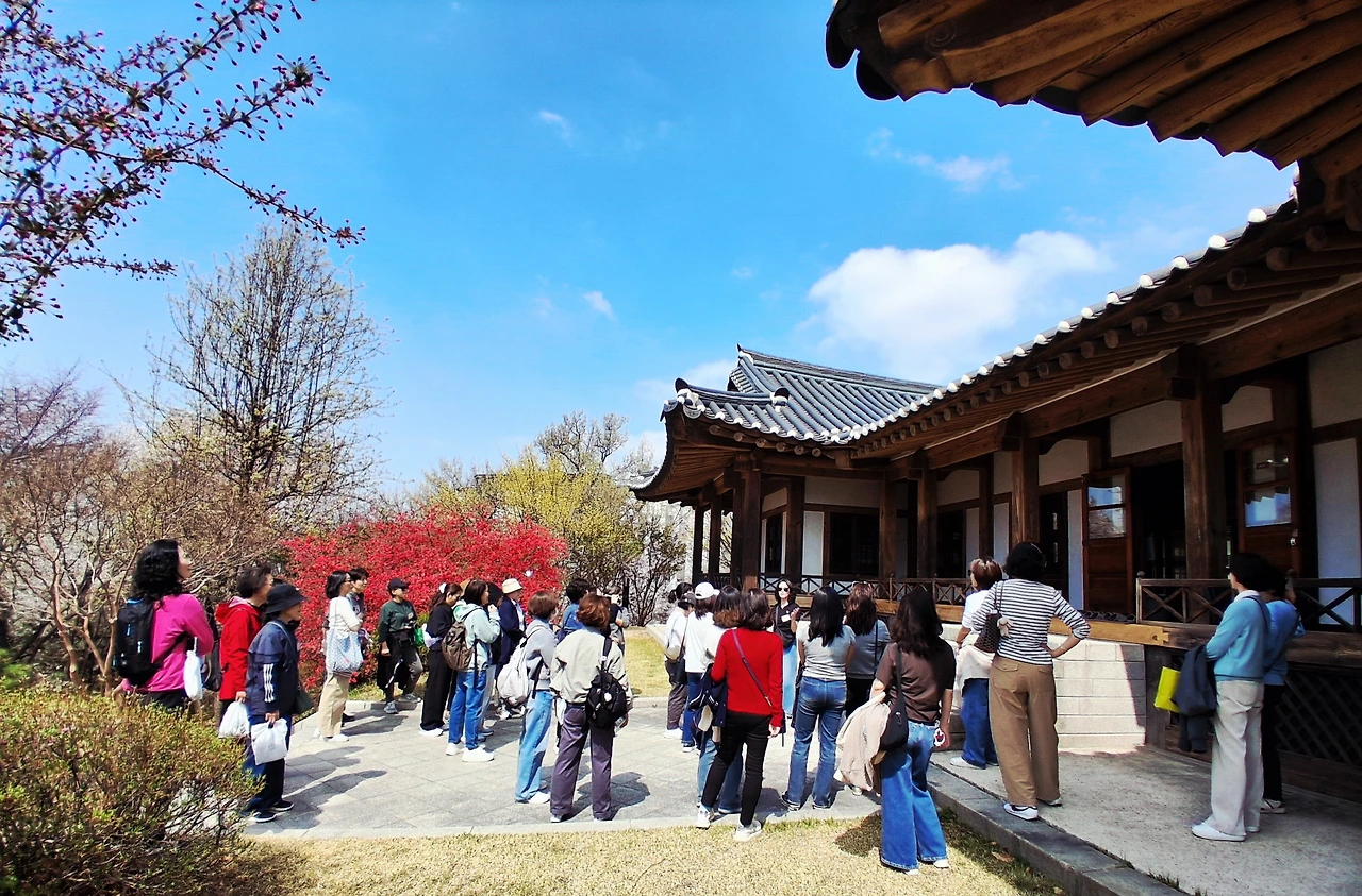 "우리 이경인들이 여기 명자나무 꽃 앞에서 이화역사관 한옥을 배경으로 단체사진을 찍으면 좋겠는데!"