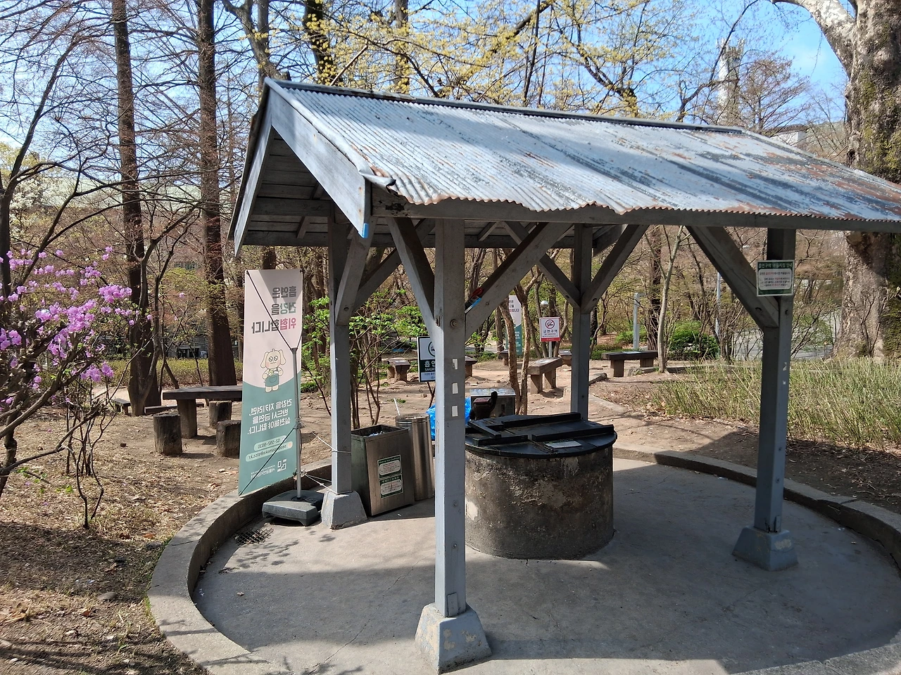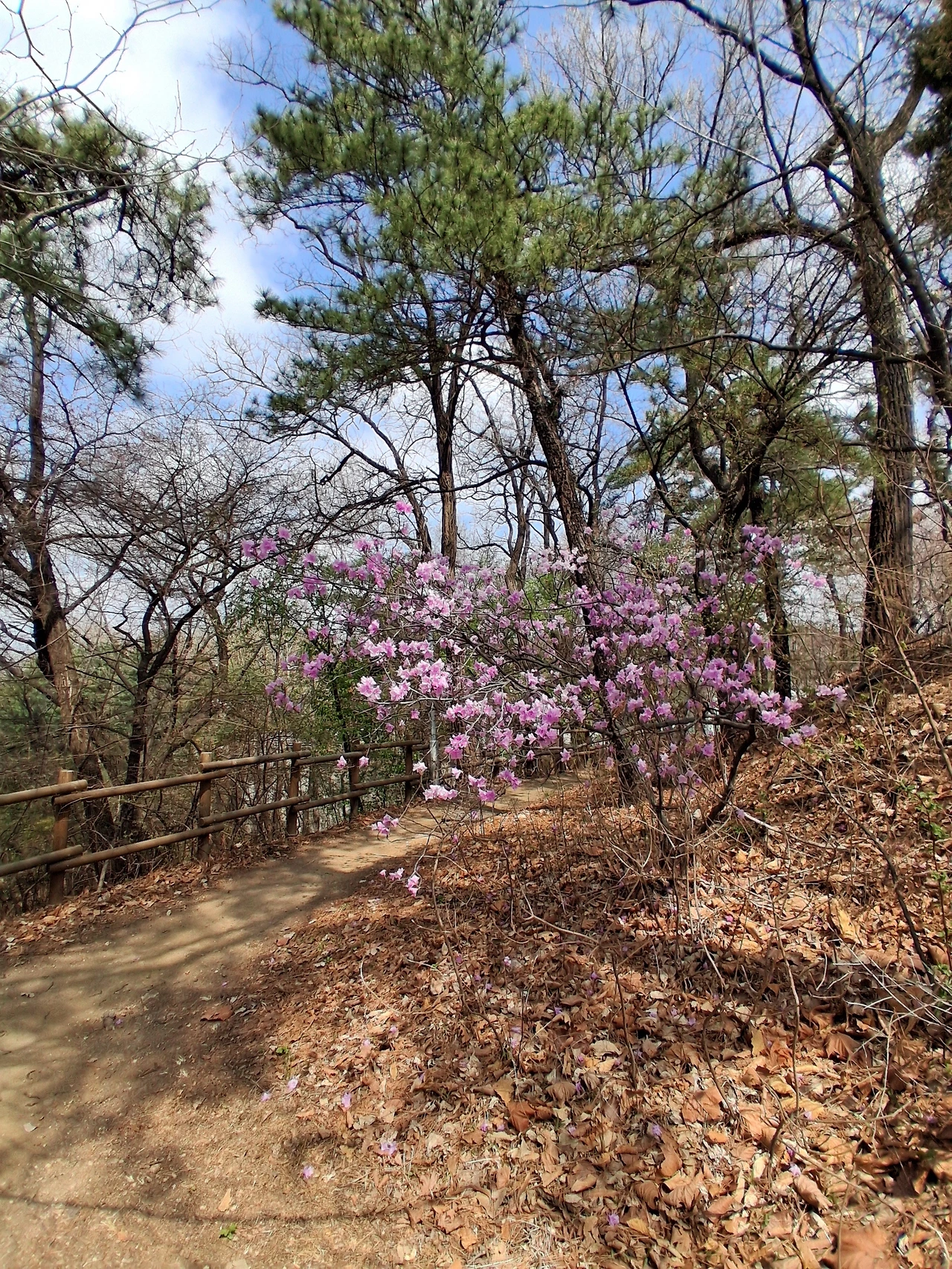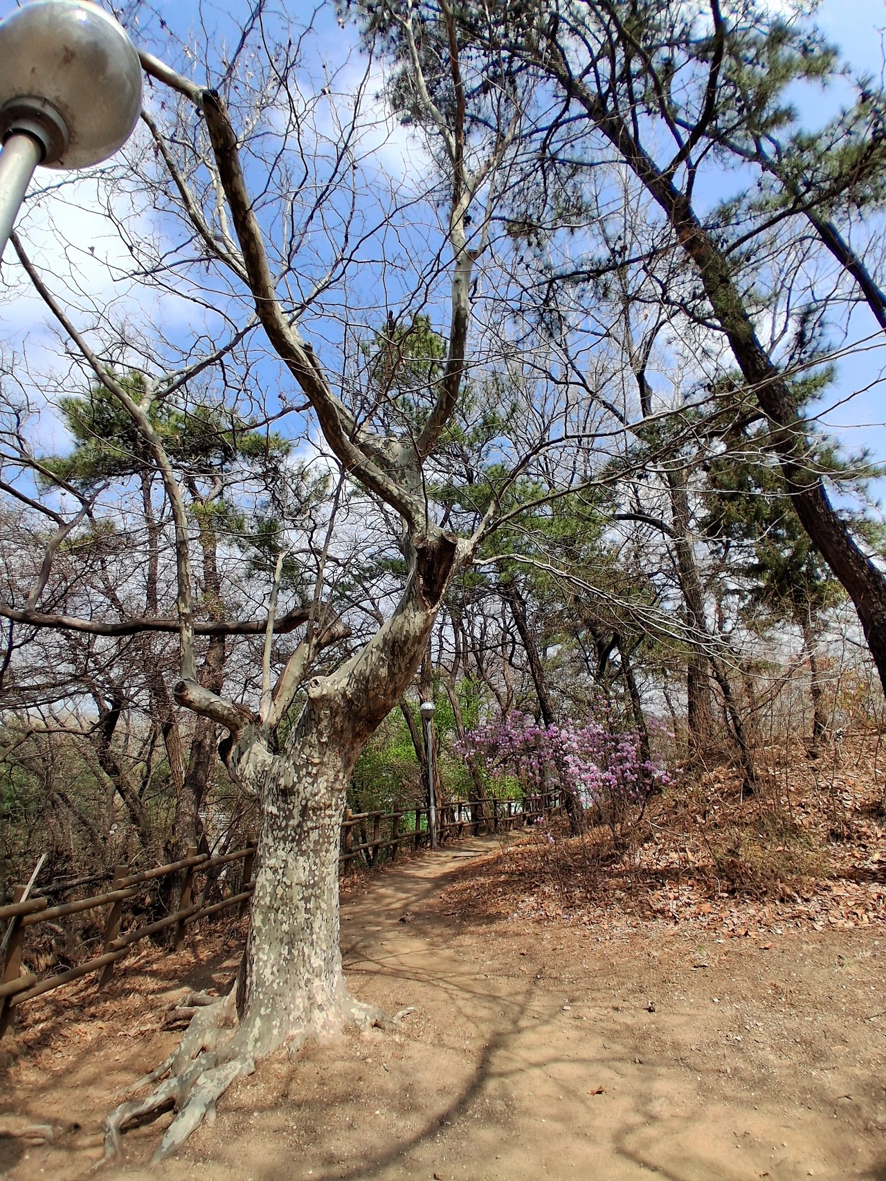 모두들 일어나 이화역사관으로 향하고 나는 잠시 뒤에 남아 팔복동산을 둘러본다. 동그란 통나무 의자 뒤 한쪽에 나무 둥치가 파인 오랜 고목 하나가 지나온 세월을 기억하는 듯 우뚝 서 있다. 그 옆에는 진달래 한 그루가 고목에게 위로를 던지는 듯 활짝 피어 있다.