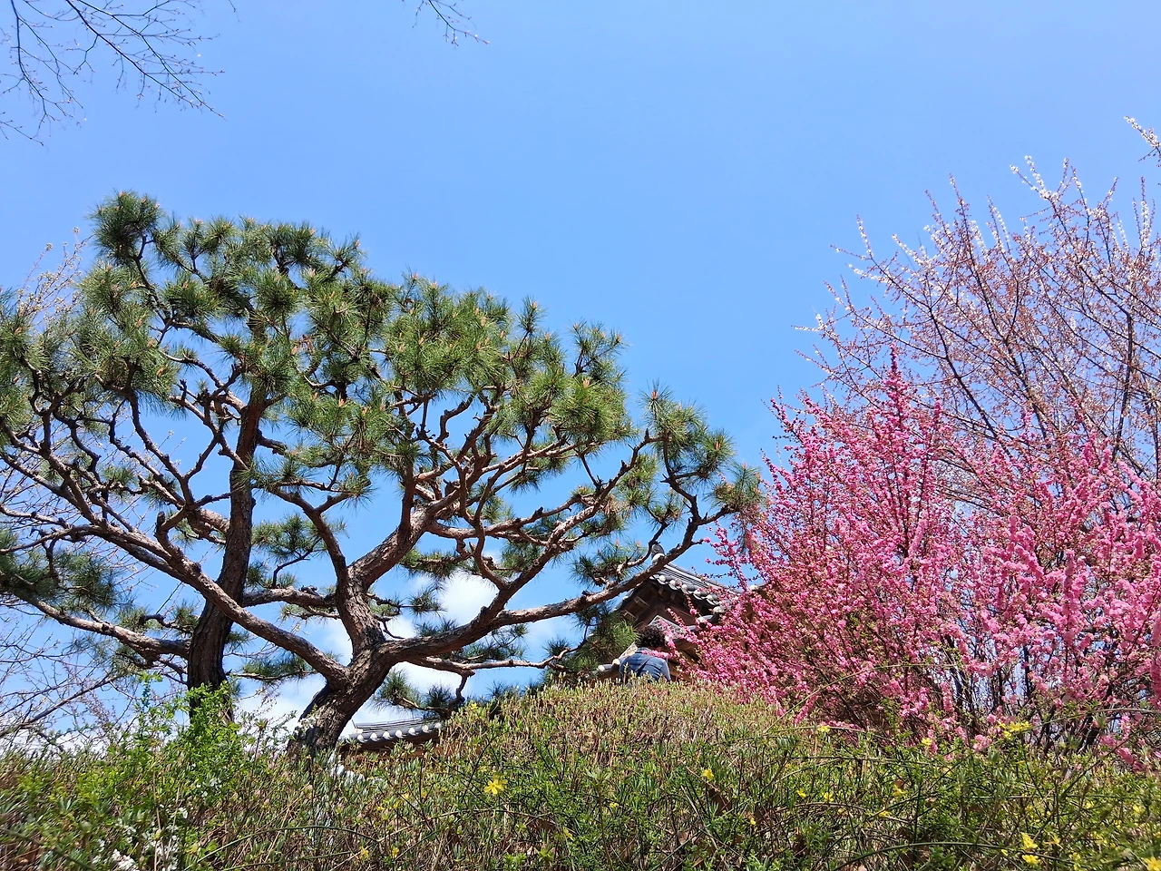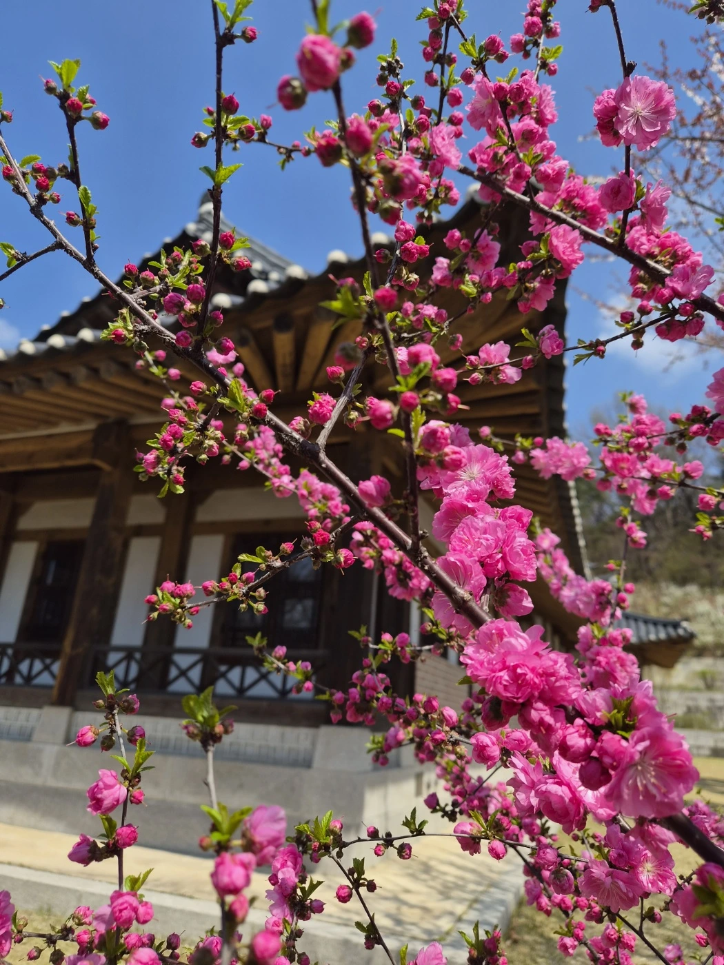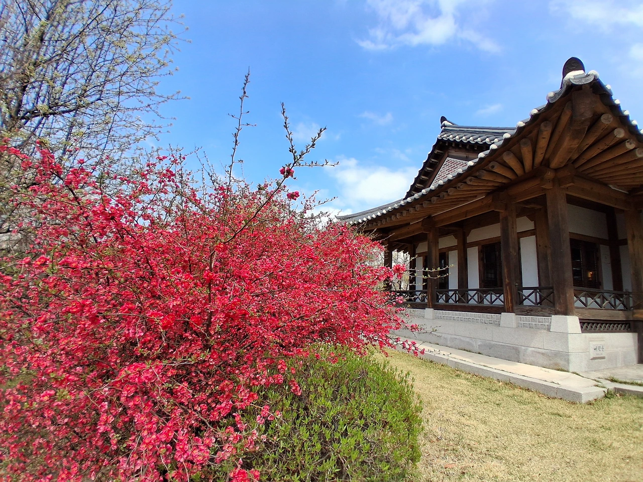 이화역사관으로 가는 길에는 개나리가 예쁘게 피어있다. 이화역사관은 처음 가본다. 한옥으로 되어 있는데, 마당 왼쪽에는 빨간 명자나무가, 오른쪽 뜰에는 진분홍 겹복사꽃이 활짝 피어 서로 조화를 이루며 한껏 아름다움을 자랑하고 있다. 한옥은 한옥대로 꽃은 꽃대로 있어도 예쁘지만, 함께 있으면 시너지 효과가 나서 고풍스러움과 화려함이 더욱 빛이 난다.