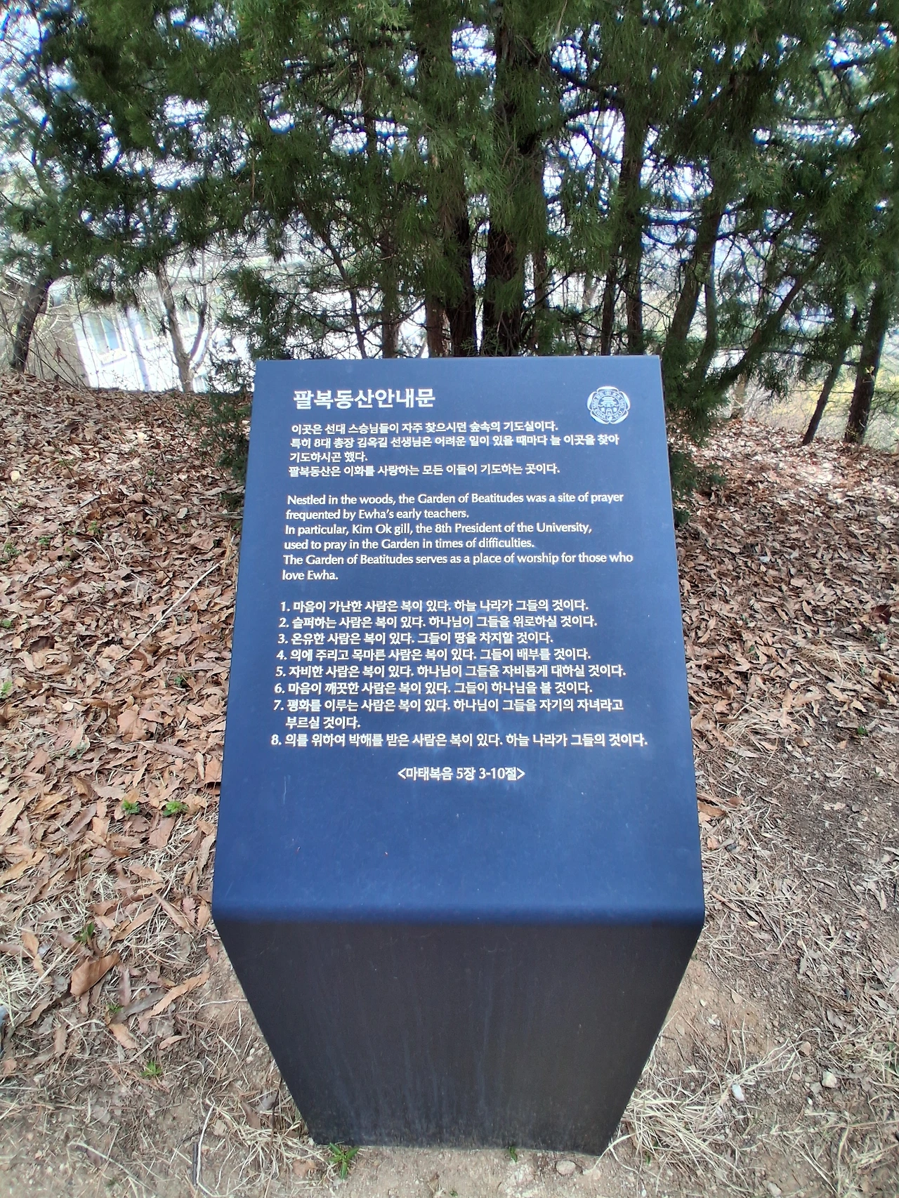 이곳은 선대 스승님들이 자주 찾으시던 숲 속의 기도실이다. 특히 8대 총장 김옥길 선생님은 어려운 일이 있을 때마다 이곳을 찾아 기도하시곤 했다. 팔복동산은 이화를 사랑하는 모든 이들이 기도하는 곳이다.