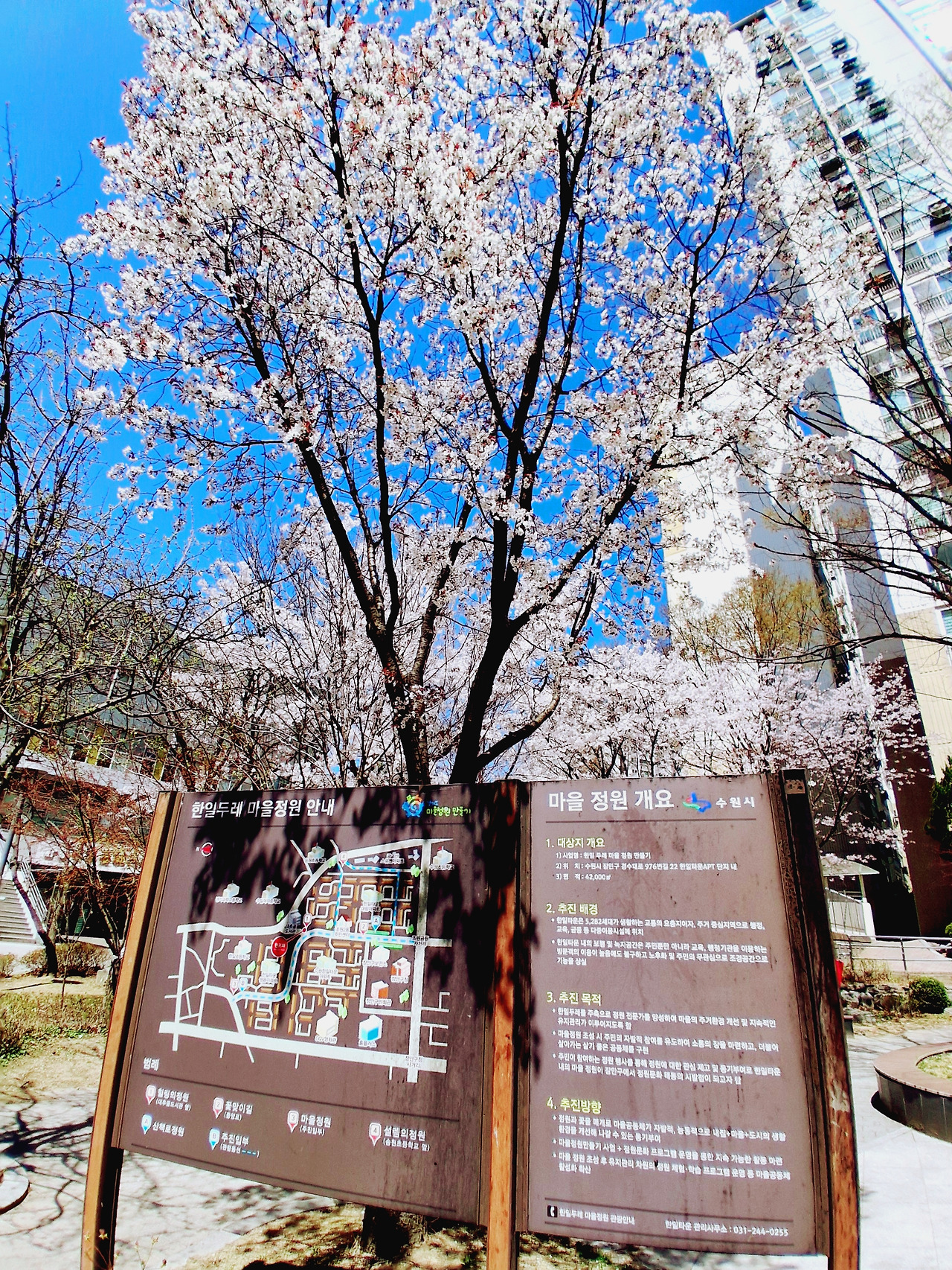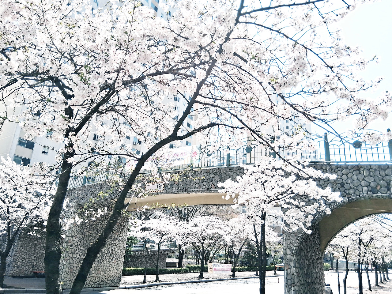 돌아오는 길 다시 벚꽃길을 걸으며 또 한동안 봄꽃 감상에 빠져든다. 이곳이 <마을 정원>이라는 안내판이 있는 걸 보니 아파트 숲 속 정원인 모양이다. 벚꽃길 한쪽에 정자도 있어서 앉아 쉴 수도 있고, 날 따뜻하면 벚꽃 보면서 이 길을 우유자적 걸어도 좋겠다. 횡단보도 대신 도로 위로 난 다리도 멋지다. 벚꽃이 아치형 돌담 다리 사이로 보이는 풍경도 근사하다.