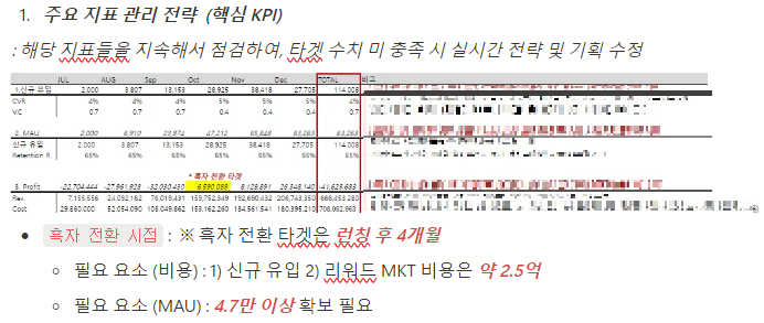 그 중 일부를 발췌해서 공유하자면, 전략과제는 1) 신규유입 2) MAU 3) Profit으로 잡았다.