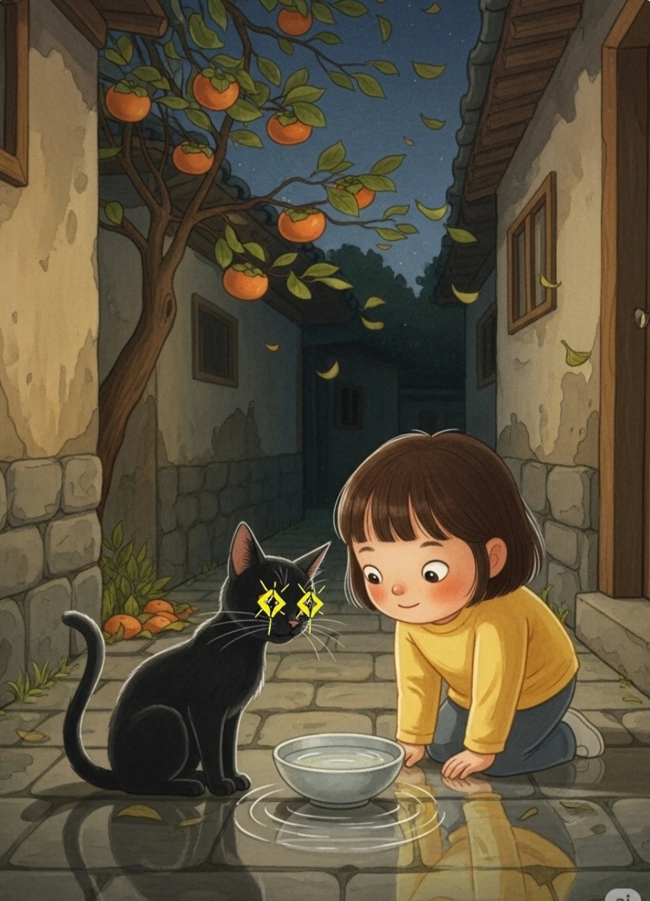 감나무가 조심조심 감 하나를 툭— 떨어뜨렸고, 그릇이 사각— 하고 대답했어. 오늘 밤의 소리들은 작은 악보 같았지.