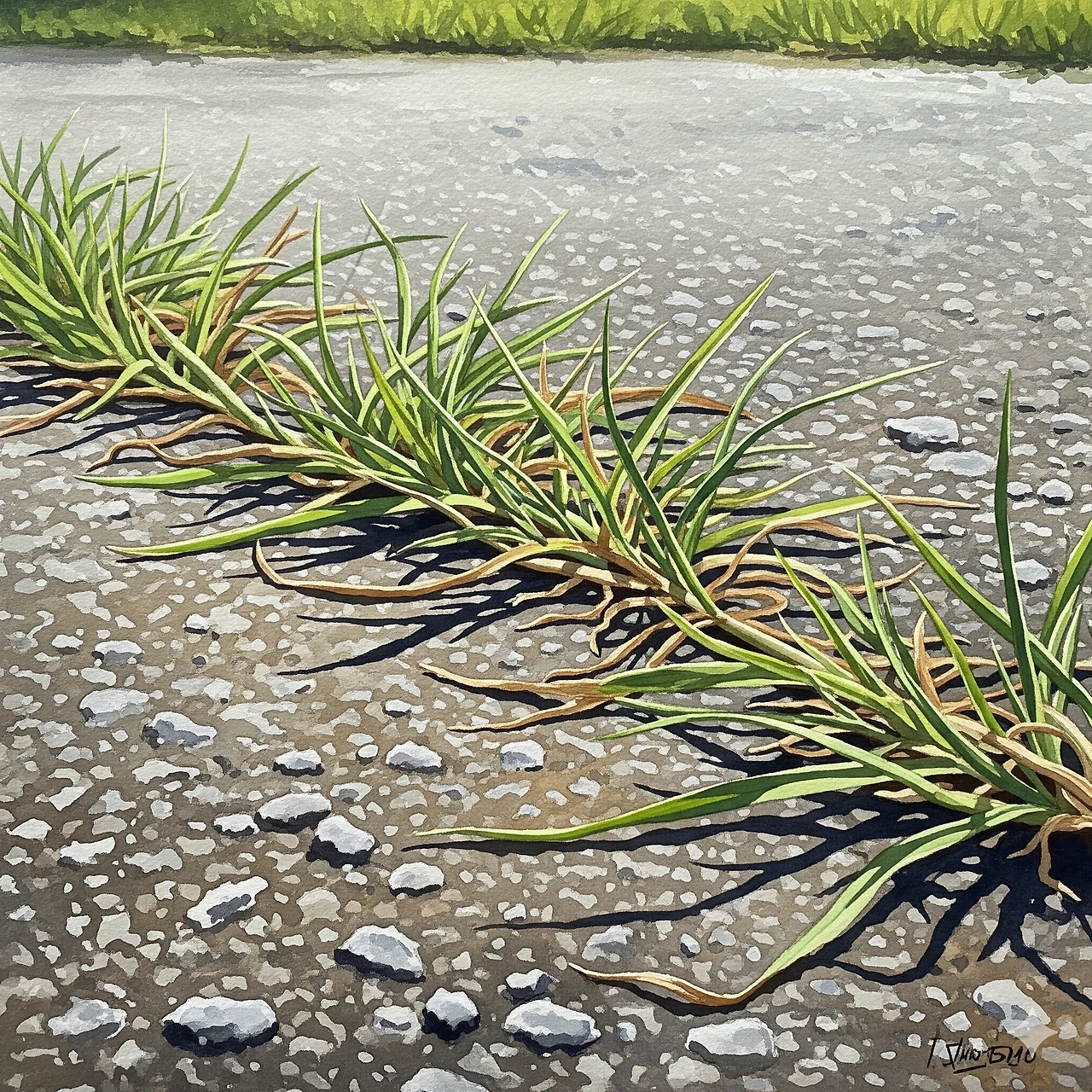 골목 끝에서 굴삭기가 한 번 울고, 뜨거운 바람이 낮게 흐른다. 깜별이는 바닥에 배를 반쯤 붙이고 바랭이의 중심을 응시한다. 고양이는 동선을 아낀다. 한 점에서 주변을 넓혀 가는 방식. 발끝이 닿는 곳마다 범위를 계산하듯, 깜별이는 두 번만 움직여 가장 시원한 그늘을 차지한다. 바랭이의 확장과 닮은 움직임. 멀리 뛰지 않아도 넓어지는 법.