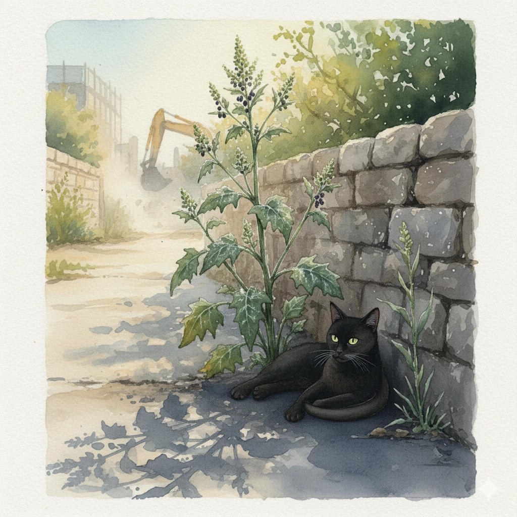 골목 끝 공사장의 철판이 낮게 울리고, 먼지가 햇빛에 반짝인다. 깜별이는 담장과 명아주 사이 그늘에 몸을 반쯤 숨긴다. 고양이는 위로 뛰지 않고, 곁으로 비킨다. 한 번에 나가지 않고, 그림자의 길이를 재면서 한 칸씩 이동한다. 명아주의 키 사이로 지나가는 눈빛이 잔가지의 리듬을 닮았다. 급하지 않게, 그러나 분명하게. 언제 서야 하고, 언제 멈춰야 하는지 알고 있는 몸.