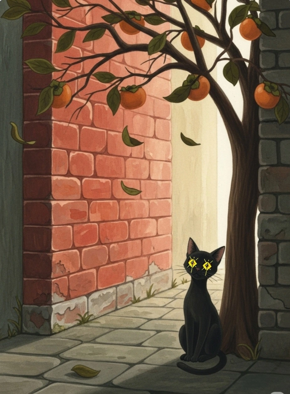 나는 자리를 정했어. 감나무 기둥과 붉은 벽돌이 만드는 그늘 한 조각. 등을 나무에 살짝 기대고, 바람의 결을 만져 봤지.