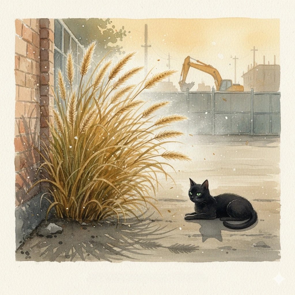 공사장 쪽에서 쇳소리가 한 번 튀고, 먼지가 얇게 흘러온다. 깜별이는 풀숲 옆 그늘에 몸을 낮춘다. 고양이의 눈동자가 이삭 하나를 따라가다, 곧 전체의 흔들림으로 초점을 풀어낸다. 박자가 맞는 순간, 몸이 먼저 알아챈다. 깜별이는 꼬리를 천천히 움찔이며 바람의 방향을 읽는다. 움직이기 전에 리듬부터 맞추는 기술.