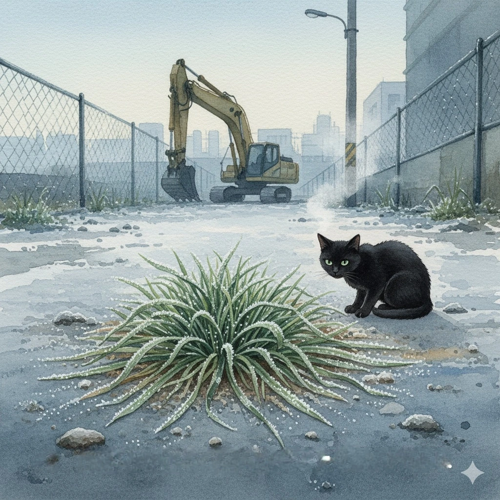 공사장 철판이 수축하며 짧게 ‘딩’ 하고 울린다. 찬 공기가 살짝 흔들리는 사이, 깜별이는 하얀 입김을 한 번 내뿜고 뚝새풀 가장자리에 발을 올린다. 고양이는 점프를 아끼고, 체온을 아낀다. 몸을 낮추고, 그늘과 볕의 폭을 잰다. 움직임을 줄이고 지속을 늘리는 전략. 깜별이의 오늘은 ‘덜 하되, 오래 하기’ 쪽에 가깝다. 겨울을 통과하는 동물의 계산법.
