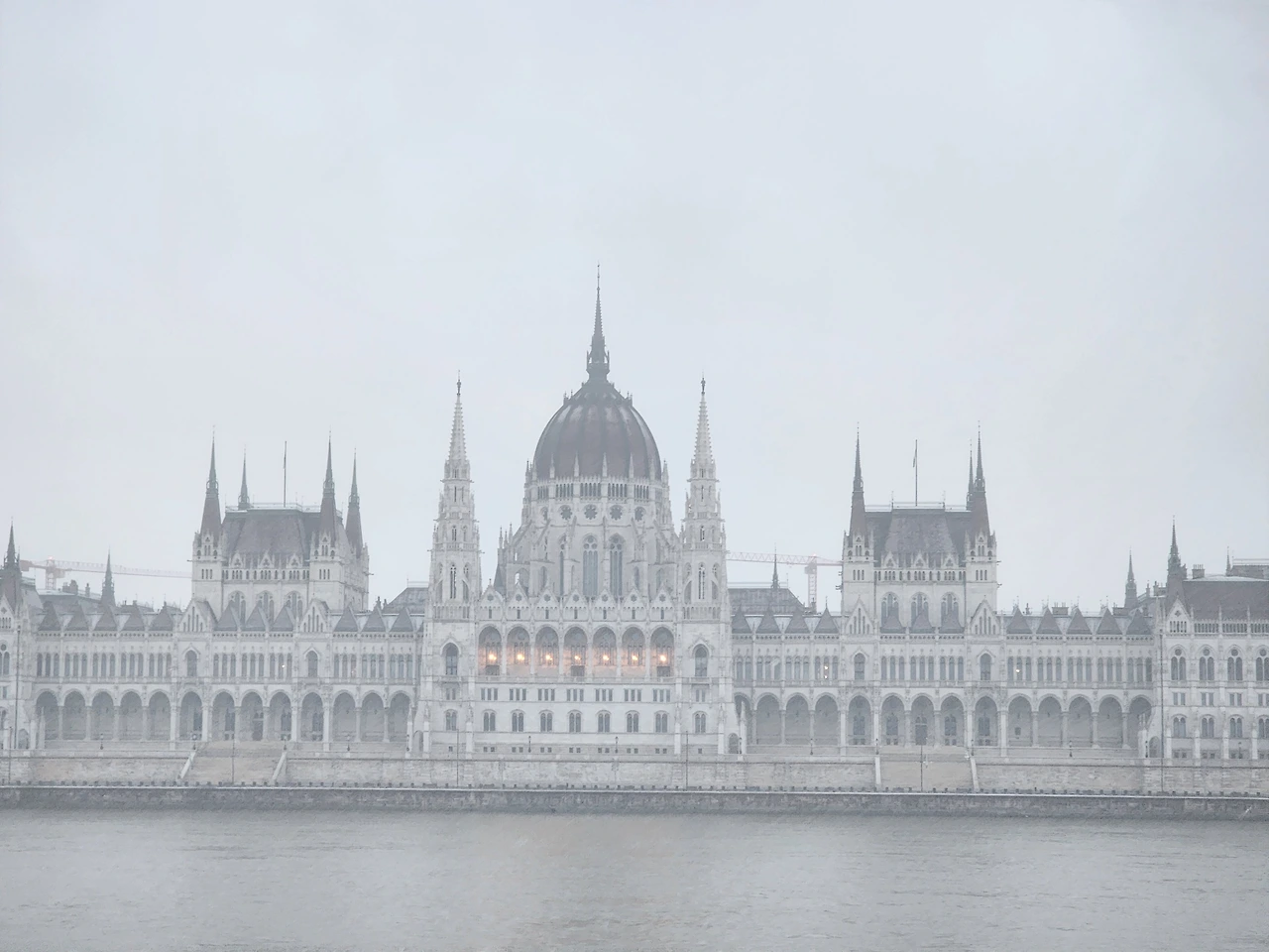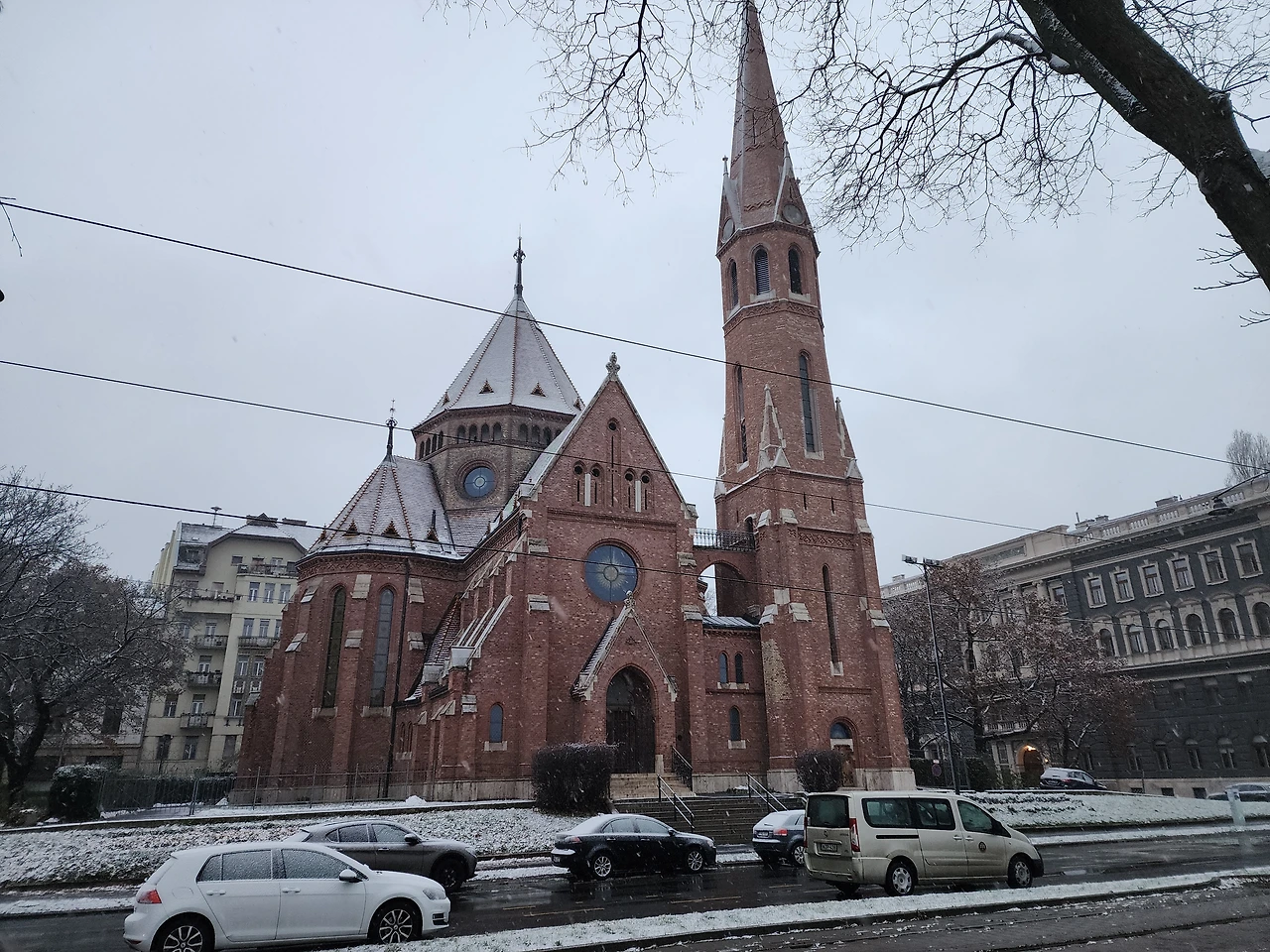 언덕 밑까지 가서 보니 올라가는 모노레일이 있었다. 새벽이라 운행은 하지 않지만 거의 150년 이상 된 명물이라고 설명하고 있었다. 초기에는 증기로 움직였다고 한다. 지금은 물론 전기로 움직이겠지만. 나는 나중에 걸어서 올라가야지 하고 마음먹었다. 다시 강쪽으로 나와 다뉴브강을 거슬러 올라갔다. 한참을 가자 웅장한 교회건물이 나타났다. 추측컨대 개혁교회일 것이다. 검색을 못하니 사전 공부한 것으로 짐작할 뿐이다 강 맞은 편에 거대한 건물이 보였다. 국회의사당일 것이다. 눈이 많이 와서 희미하게 보이지만 분명하다 이쪽 언덕에 어부의 요새가 있을텐데 시야가 흐려서 잘 안보인다.