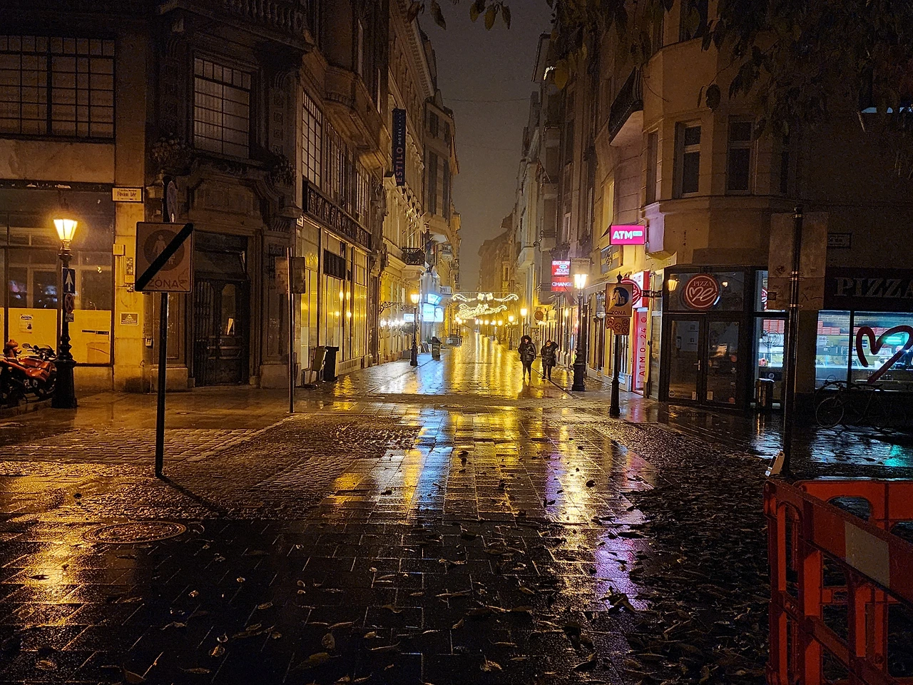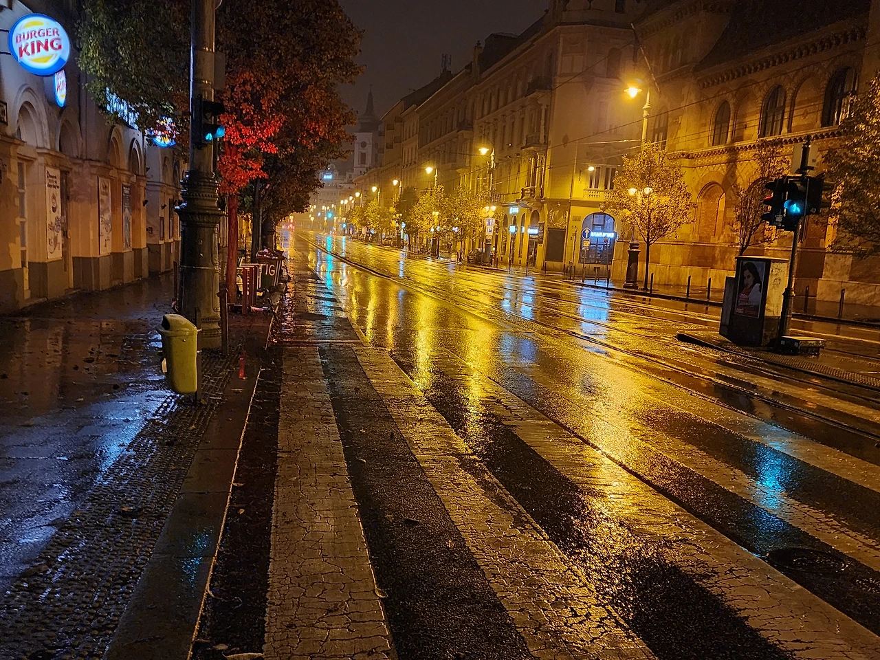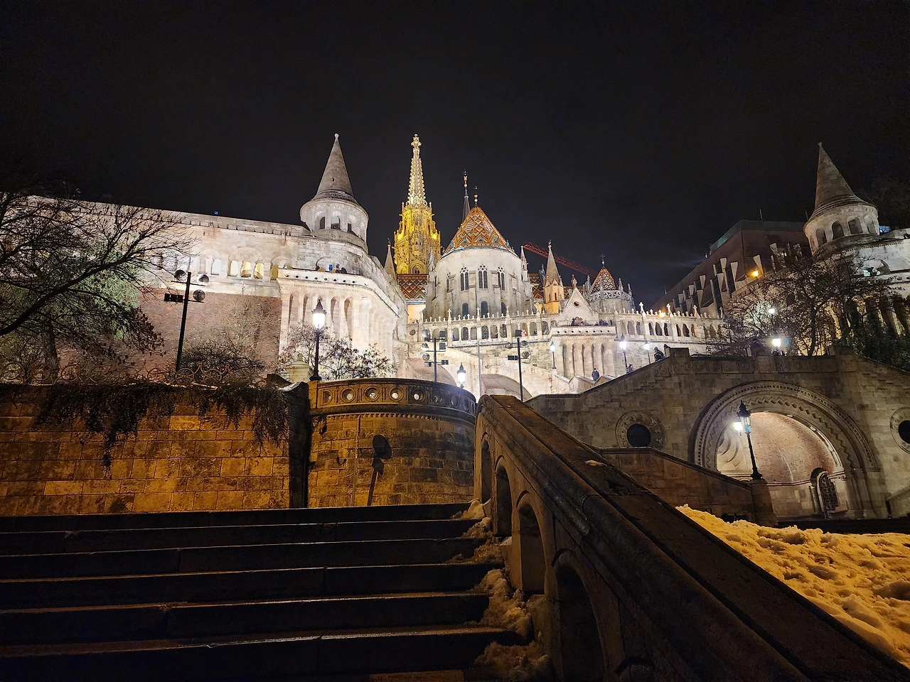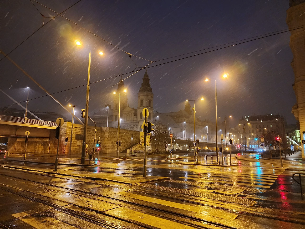 눈오는 부다페스트의 새벽거리. 조명때문인지 황금빛이 난다