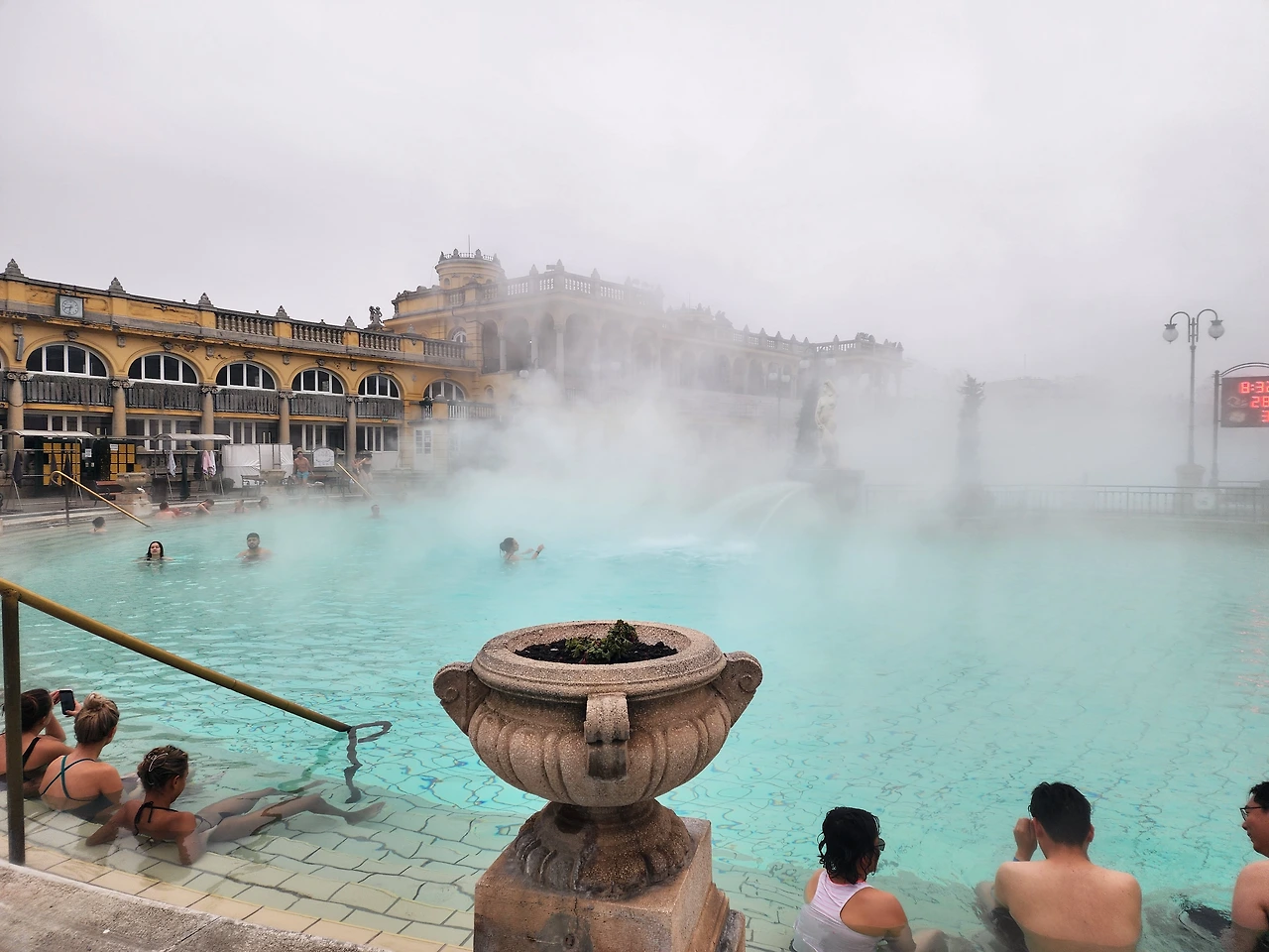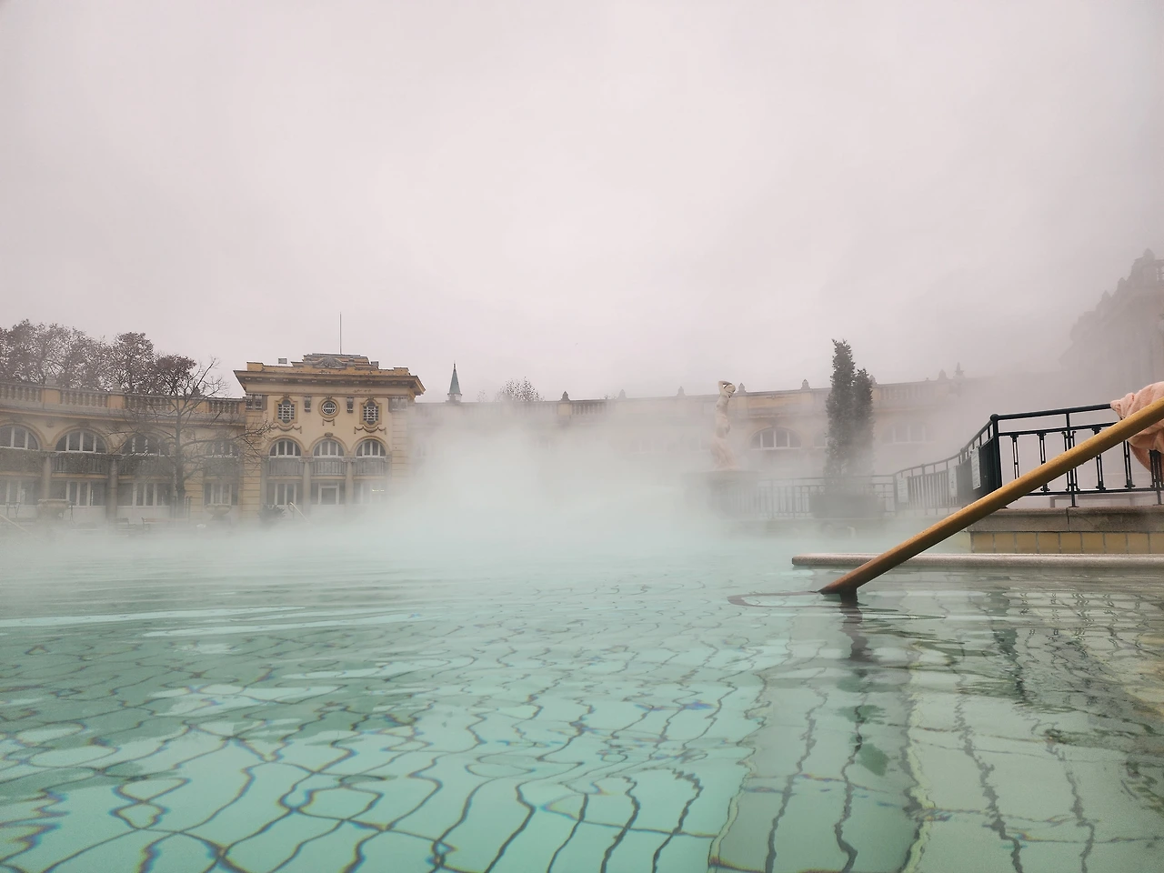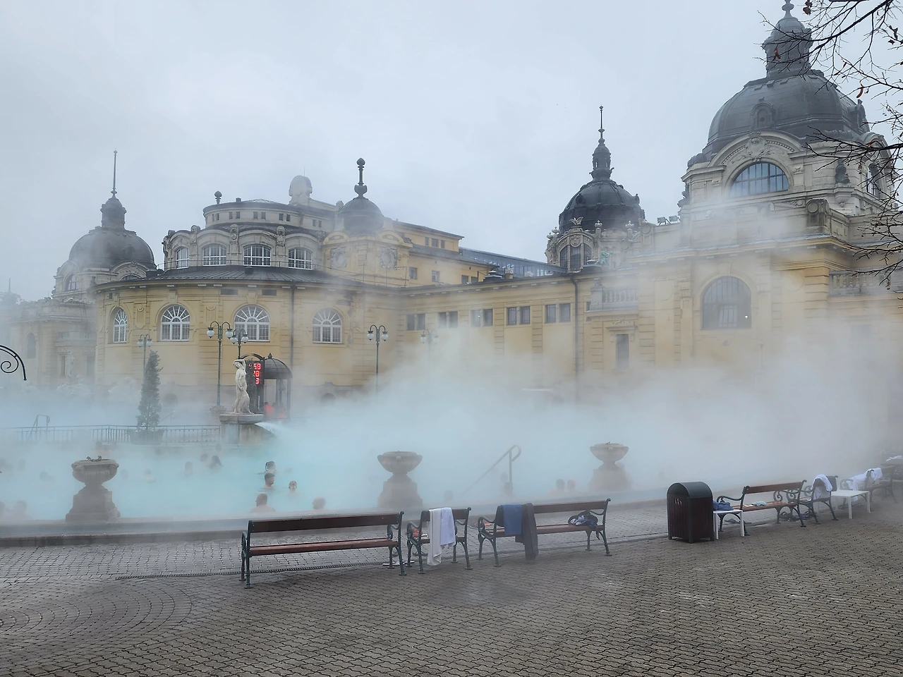 월요일은 온천에 가기로 한 날이다 주말을 피해야 해서 월요일로 잡았다. 체코 카를로비바리에서 온천수 샘솟는 모습과 물맛만 보고 무척 아쉬워했는데 유럽인들 언어로 드디어 스파를 해본다. 그것도 야외온천에서. 전철역에서 가까워서 찾기는 쉬웠다. 세체니 온천이다. 가격은 7500 포린트. 여기다 3.7을 곱하면 된다. 한화로 27, 750원이다. 헝가리 GDP 가 대략 18,000 불로 우리의 한 60% 되니까 비싼 가격이다. 주말은 더 비싸다. 일부러 일찍가서 한 두시간 몸을 담그고 돌아올 계획을 세웠다. 운치는 있었는데 물의 온도가 40도가 채 안된다. 조금 아쉬웠다. 옆에 수영장레인이 있어서 수영도 함께 했다. 혹시 이곳에 겨울에 오실 분들은 큰 수건과 슬리퍼는 반드시 챙겨오기를. 빌릴 수도 있지만 비용을 절약하고 싶다면 숙소 수건을 들고 오면 좋다. 이동 시에 발이 시려워서 슬리퍼가 필요하다. 실내탕도 있고 사우나도 있다.