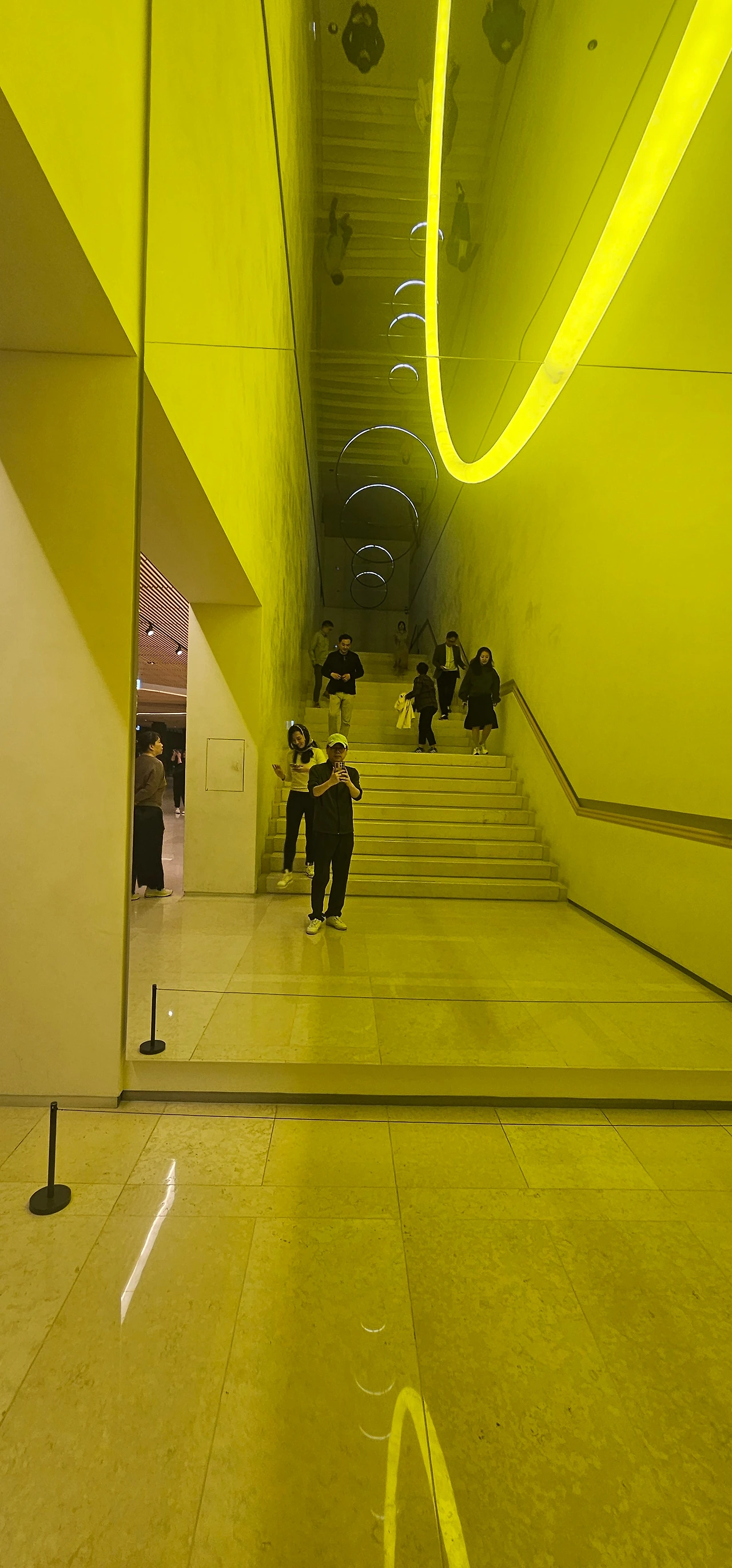 달 항아리를 5분 이상 응시했던 것 같다. 무한한 상상을 가능케 하는 백색의 질감들. 모든 것을 다 품어줄 듯한 넉넉함. 능력만 된다면 집에 하나 두고 일이 잘 안 풀릴 때, 또는 격한 감정에 휩싸일 때 한 번씩 쳐다보면 좋겠다는 생각이 들었다. 1층의 거울로 장식된 계단과 조형물들, 그리고 오렌지 색 조명도 인상적이었다. 현대적 감각의 조화가 좋았다. 많은 사람들이 사진을 찍고 있었다. 가방을 보관하는 검은색 사물함마저 건물 전체와 조화를 이루고 있었다. 활자와 모니터만을 쳐다보던 나의 일상에 새로운 활력소가 되어주었다.