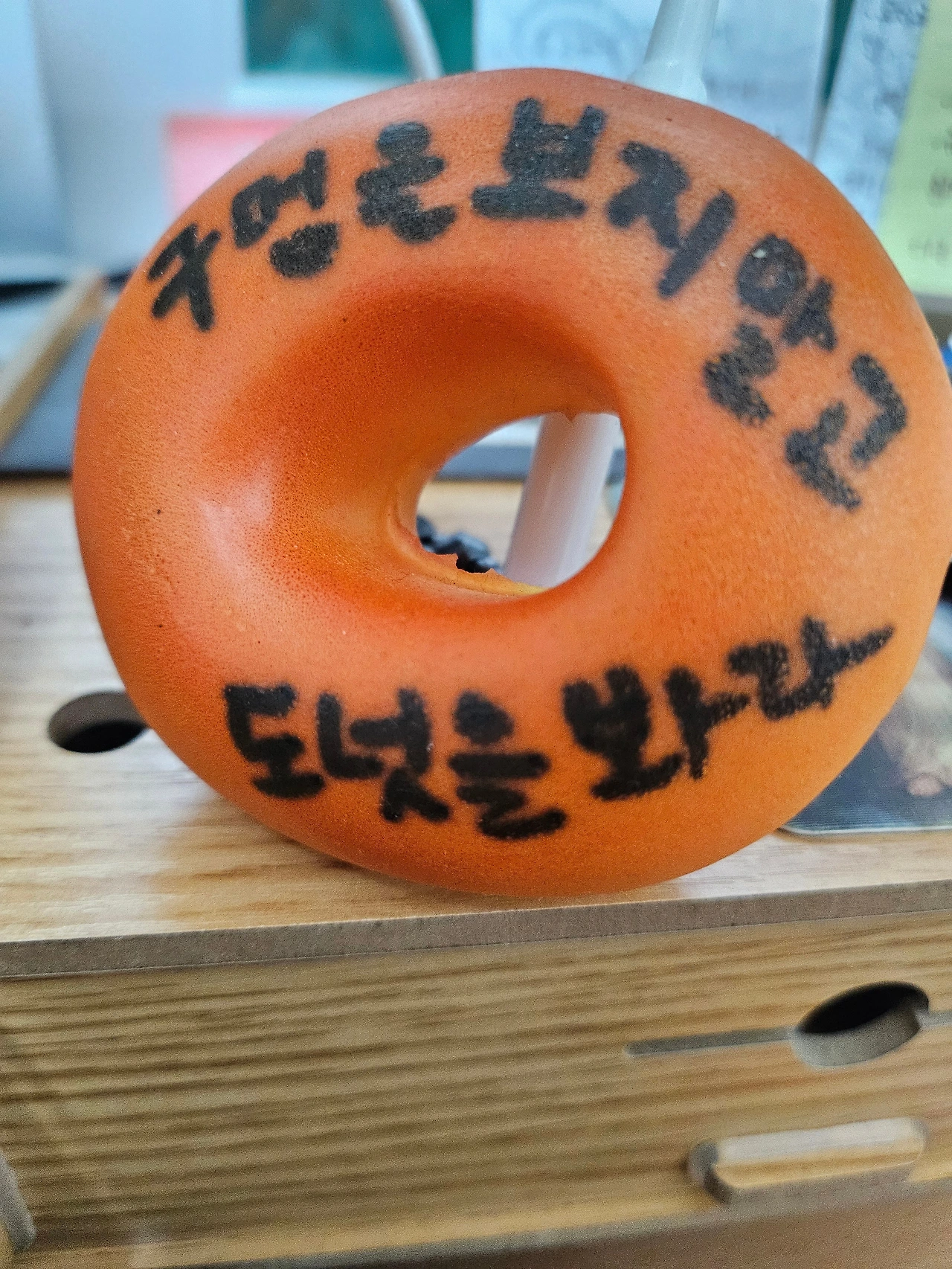 요즘 내가 힘들 때마다 자주 되뇌고 업무 공간에서도 자주 볼 수 있도록 도넛 모형에 직접 써서 자주 되뇌는 문장이다.