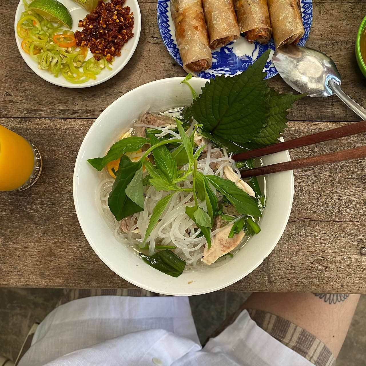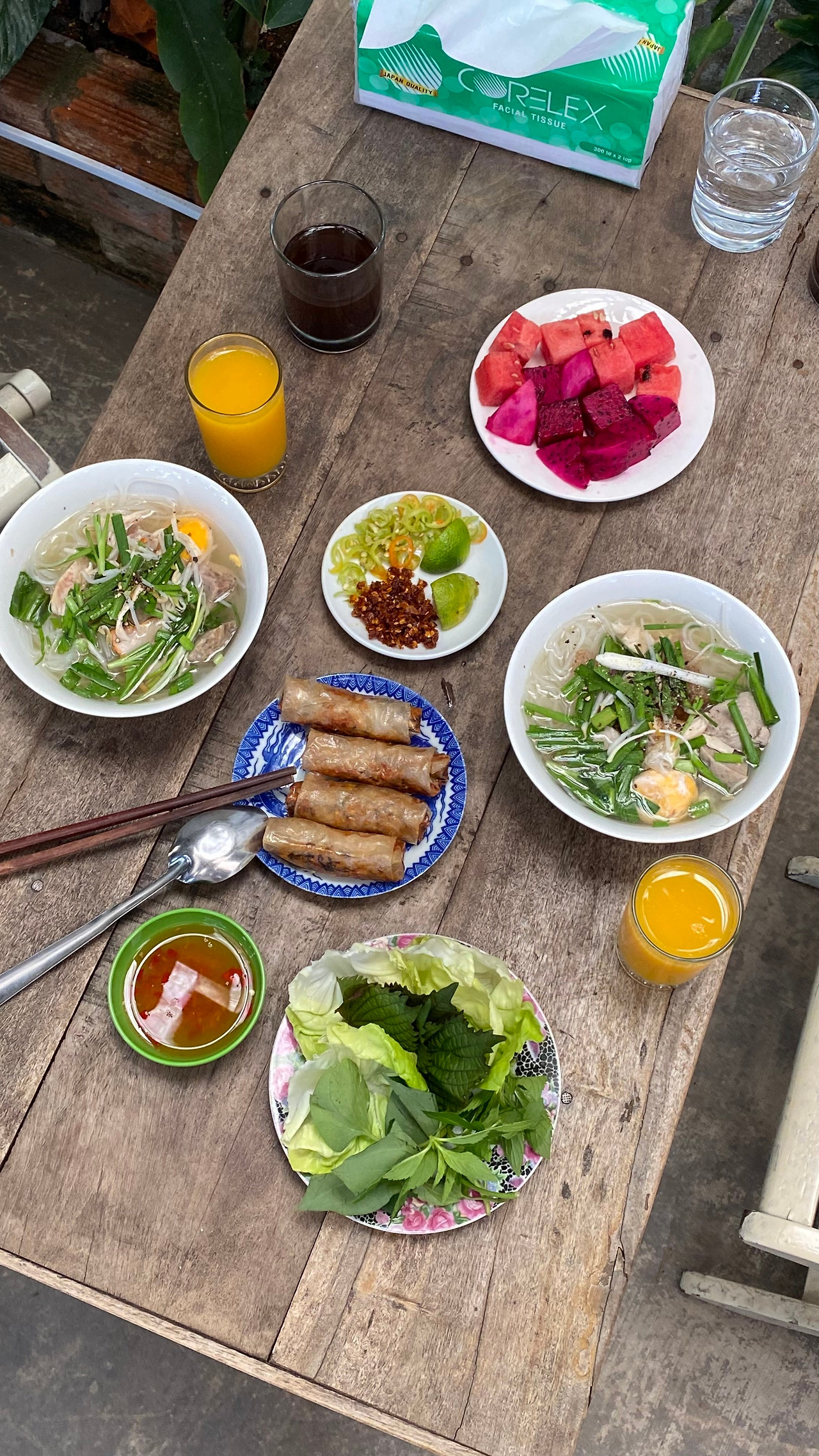 오늘 내어주신 아침밥은 계란이 하나 통으로 들어가고 햄과 고기도 들어가서 쌀국수의 탄수화물에 단백질까지 꽉찬 식사였습니다. 어머니는 새로운 게스트를 맞이하느라 바쁘셔서 June이 가져다줬습니다.