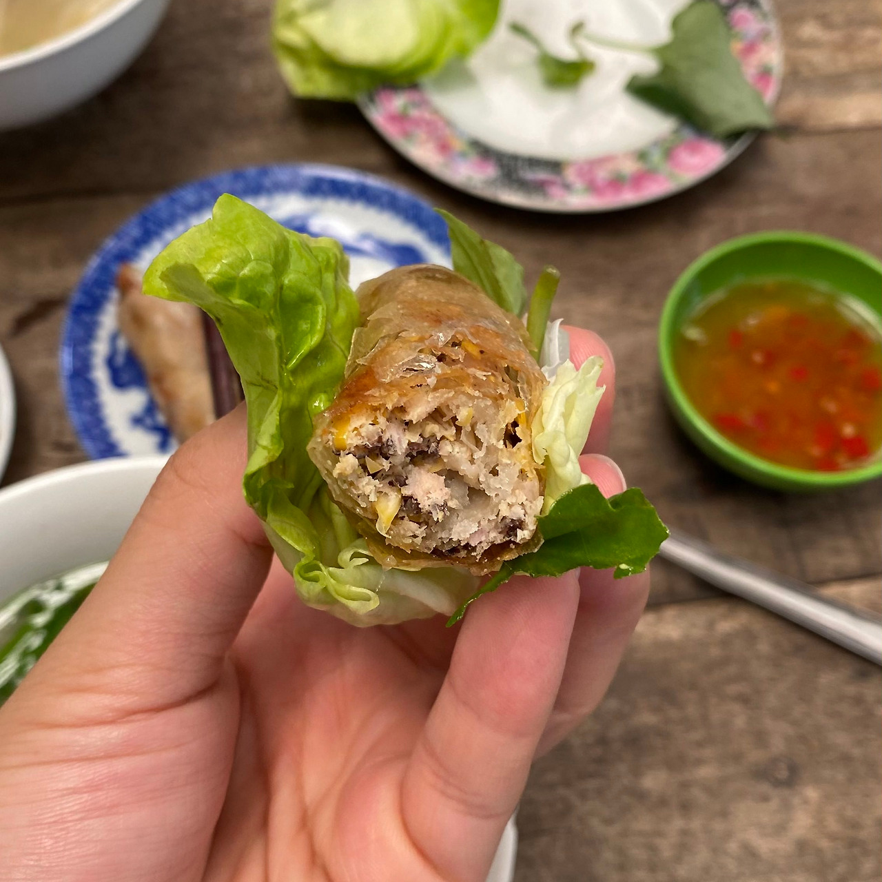 직접 만들어주신 짜조가 참 매력적이었습니다. 다진 돼지고기와 숙주, 버섯이 들어간것 같은데 어찌나 야무지게 팬에서 구워내셨는지 딤섬처럼 촉촉한 속재료를이 다 살아있었습니다. 같이 내어주신 미니쿠스에 올려서 느억맘소스에 흠뻑 적셔서 먹었습니다.