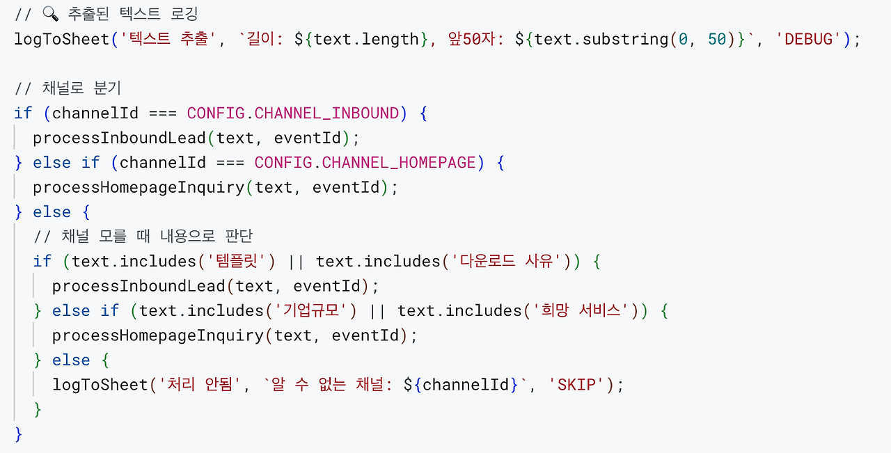 가장 어려웠던 건 슬랙에서 메시지를 가져오는 부분이었다. 슬랙 API를 연결하면 모든 채널의 메시지가 한꺼번에 쏟아진다. 그중에서 특정 채널의, 특정 형식의 리드만 골라내야 했다. 그런데 메시지 형식이 제각각이었다. 어떤 건 이름이 먼저 나오고, 어떤 건 회사명이 먼저 나오고, 어떤 건 줄바꿈이 있고 없고.