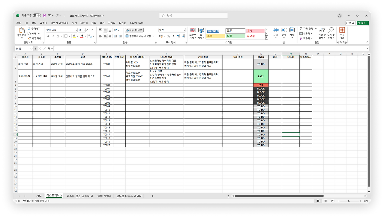 지라의 체크리스트처럼 체크박스 형태로 체크리스트를 만드는 방법도 있다. 하지만 일반적으로 엑셀을 사용하는 것이 보편적이다. 이 경우, 표를 활용하기 때문에 구조화가 중요한데, 잘 구조화된 테스트케이스는 테스트 과정의 효율성을 높이고, 누락과 중복을 방지하는 데 큰 도움이 된다. 나는 주로 다음과 같은 방법으로 작성한다.