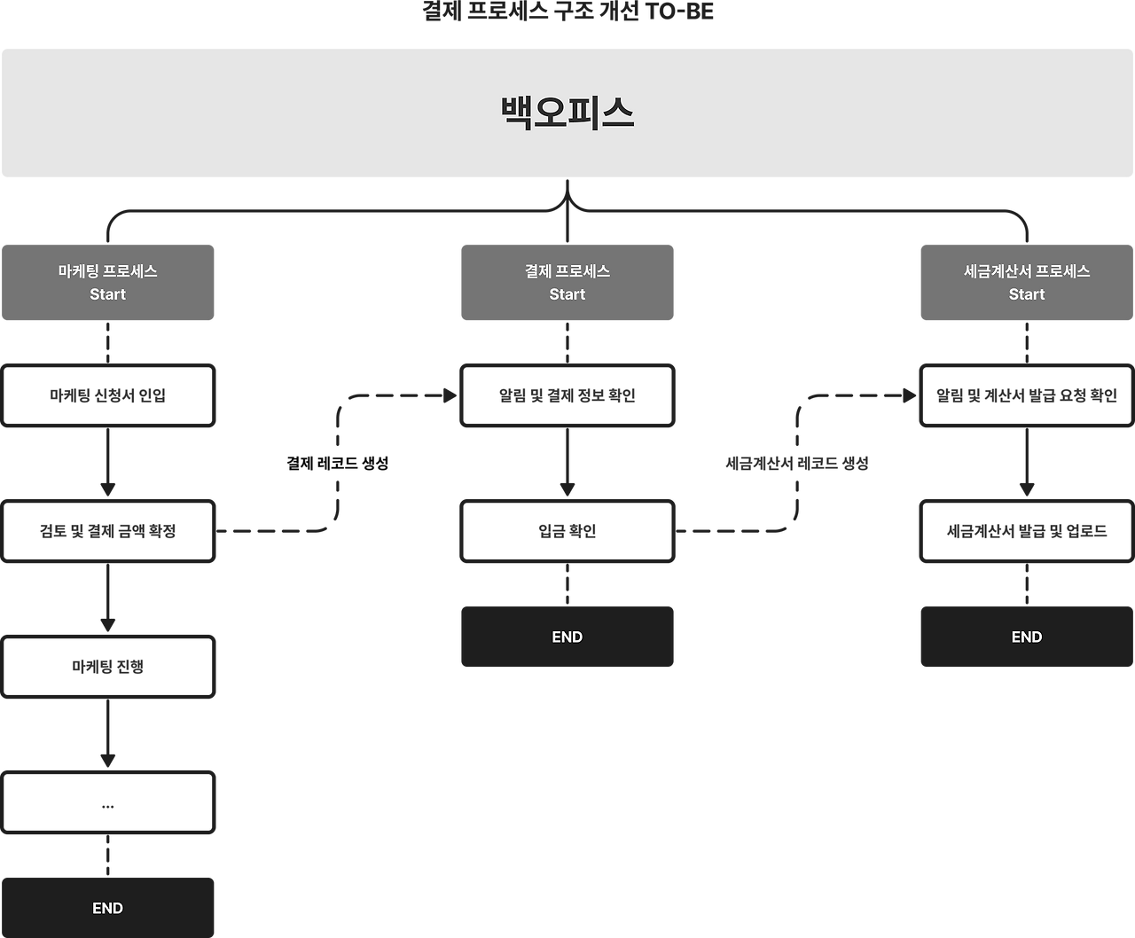 - 이를 위해 결제 정보와 세금계산서 정보에 생성되는 레코드들의 흐름이 꼭 필요한 담당자 액션만으로도 이어질 수 있게 기획한다.