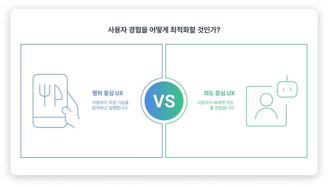 사용자 경험(UX)의 기준과 본질이 빠르게 변화하고 있다. 과거에는 사용자가 직접 메뉴를 탐색하고 기능을 찾는 ‘행위 중심’ 경험이 주를 이루었다. 사용자는 필요한 기능을 직접 찾아서 실행하고, 그 과정을 통해 목적을 달성했다.