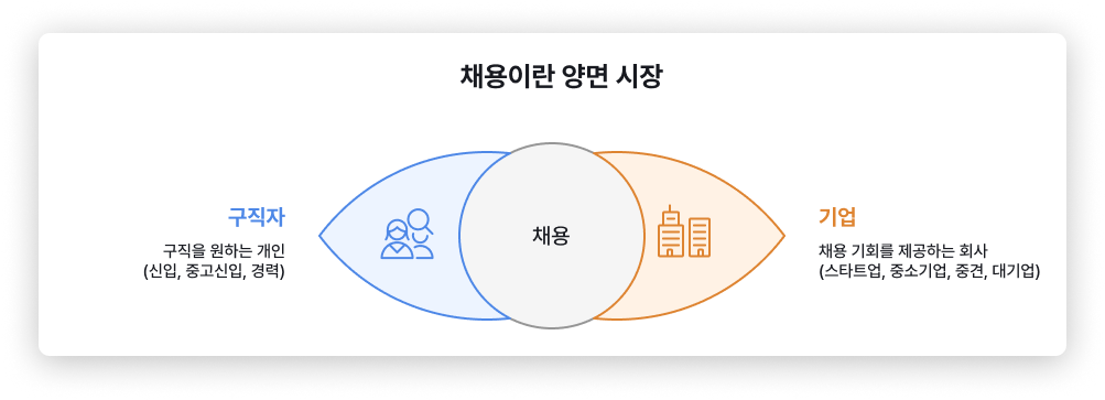 이들의 관계를 깊이 들여다보면 거대한 플라이휠과 같다. 이커머스 시장이 '판매자-플랫폼-구매자'이 셋이 잘 맞물려야 돌아가는 시장인 것처럼, 채용 시장 또한 구직자(개인 회원)와 기업(고객사)이 '채용'이라는 키워드를 중심으로 서로를 끌어당기고 밀어주는 양면시장의 구조다.