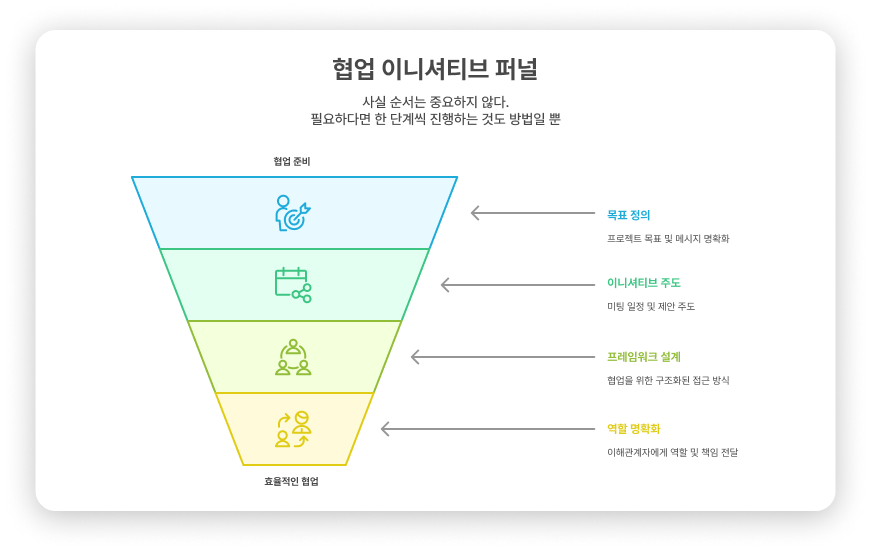4. 아이디어를 버리는 것에 대한 아쉬움이 남을 수도 있는데, 개인의 욕심보다 조직의 성과, 프로젝트의 속도(효율)가 더 중요하다고 생각한다면, ‘내가 낸 아이디어를 끝까지 밀고 가야 한다’는 생각에 집착하지 않을 수 있다.