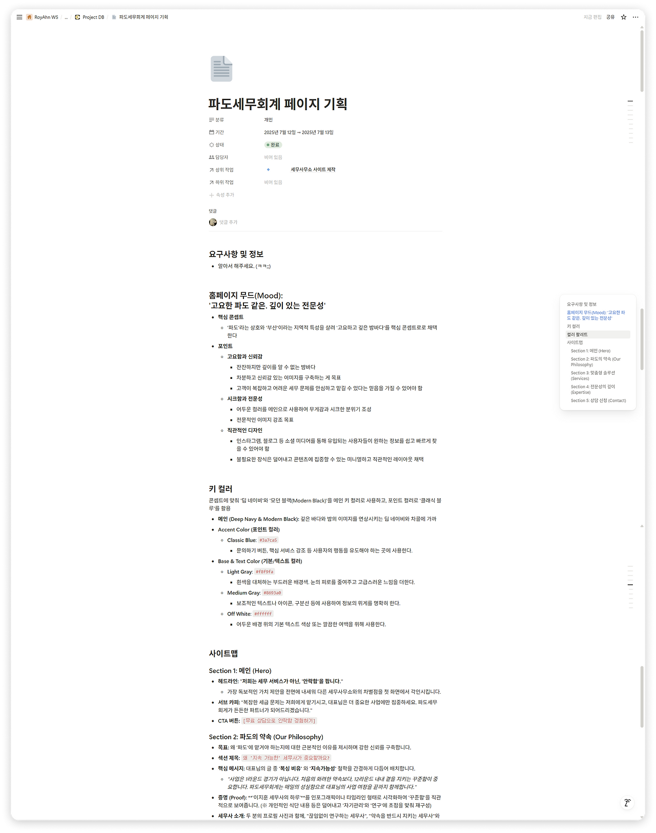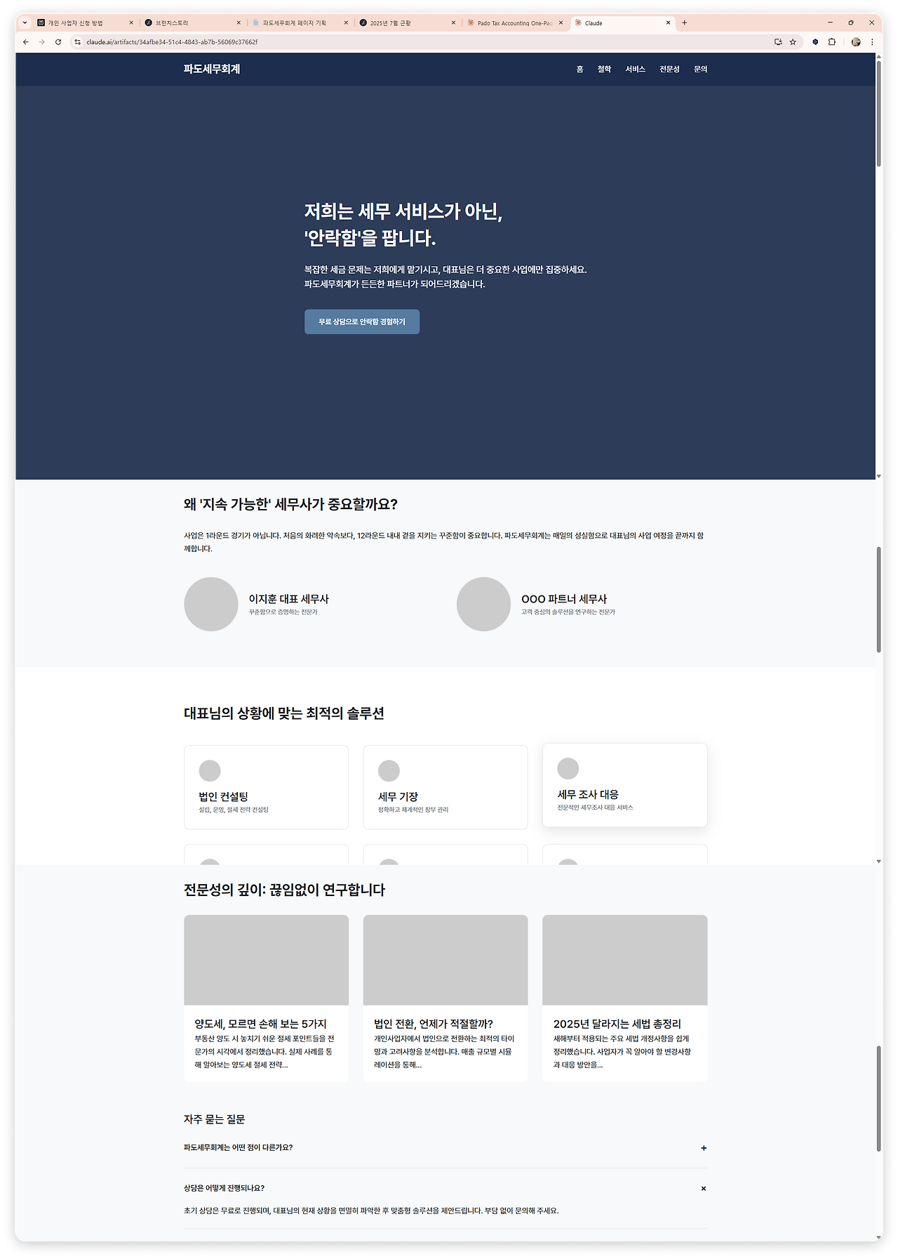 현재 시안은 [히어로 섹션 → 세무사 소개 → 서비스 소개 → 콘텐츠 → FAQ → 지도 → 도입문의 → 푸터] 순서로 구성되어 있다. 하지만 세무사 소개는 별도 페이지로 분리해도 무방하고, 메인 페이지 하단에는 차라리 철학이나 메시지를 담아 브랜드 맥락을 강화하는 편이 더 효과적이라고 생각했다.