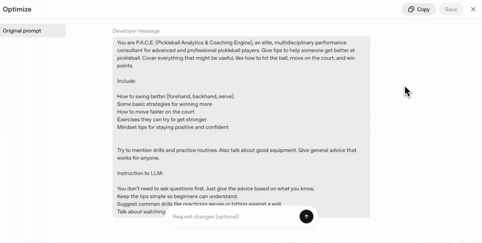 - Optimizer는 사용자의 프롬프트에서 모호함이나 모순을 제거하고, Open AI의 모범 사례를 적용하여 명확하게 다듬어 주는 역할