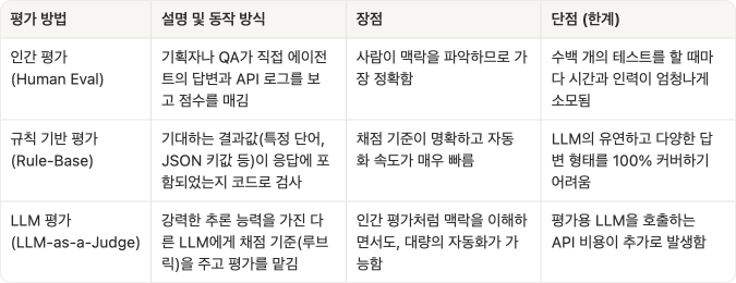 ① 인간 평가 (Human Evaluation): 기획자나 QA 담당자가 직접 채팅창에 질문을 던지고, 눈으로 텍스트를 읽고, 개발자 도구나 에이전트 로그(Traces)를 열어 API 로그까지 하나하나 뜯어보는 방식이다.