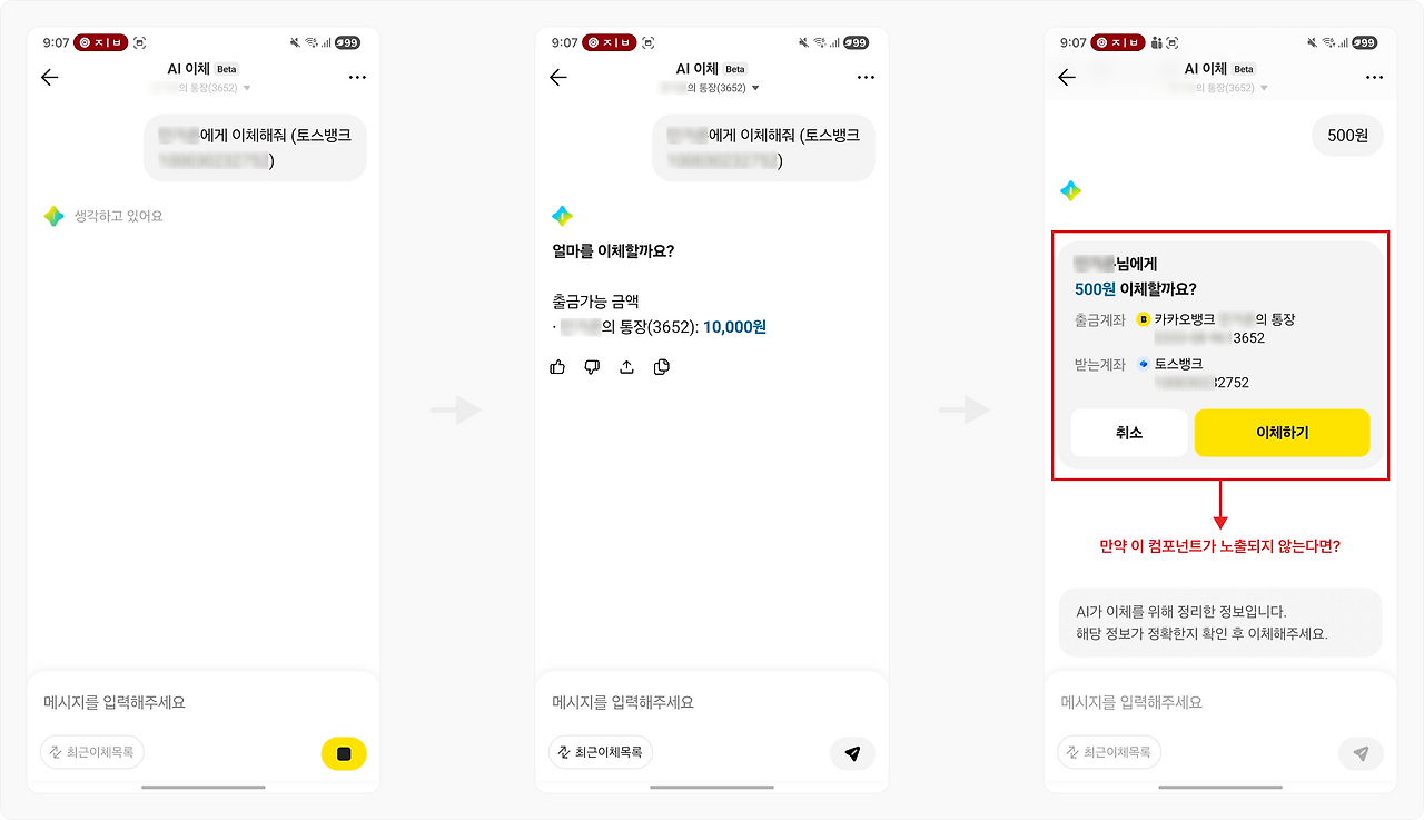 예를 들어 카카오뱅크 AI에게 "계좌이체 하고 싶어"라고 말했다고 치자. 챗봇이 "네, 계좌이체를 도와드릴게요"라고 텍스트로만 대답하면 아무 소용이 없다. 카카오뱅크 AI 서비스 설계상 화면에 "정확하게 계좌 이체를 할 수 있는 UI 컴포넌트"를 띄워줘야한다.