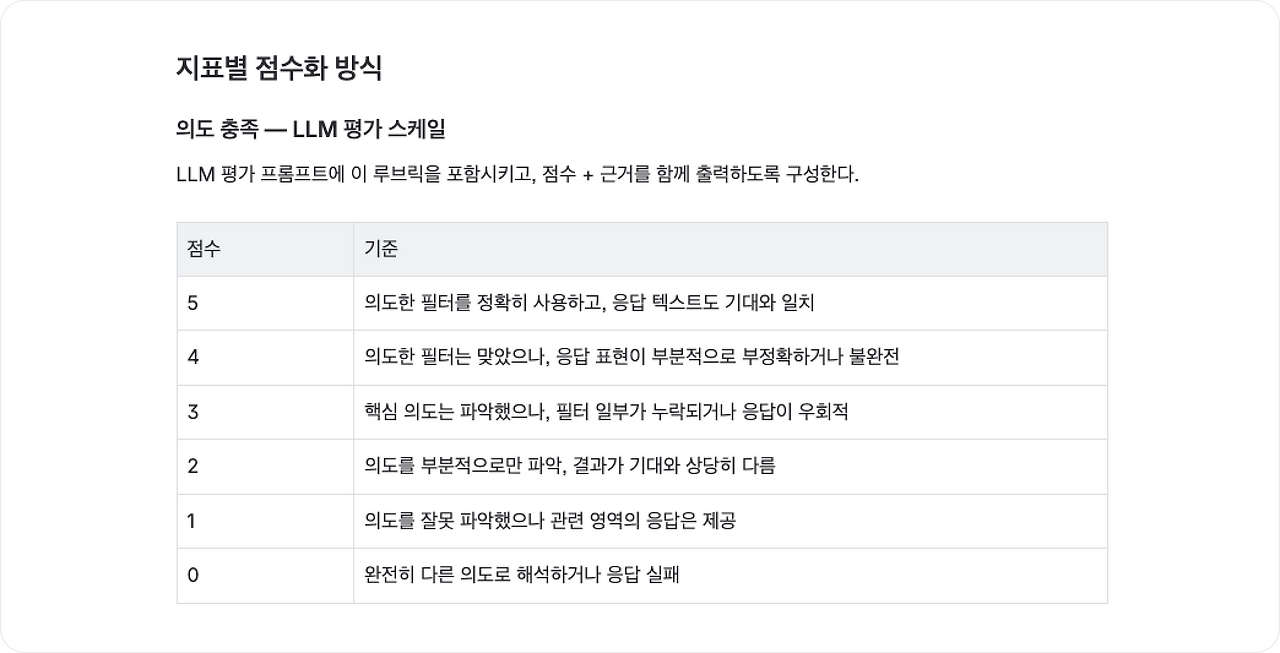 ① 의도 충족 (정성): 사용자 의도에 맞는 커뮤니케이션 품질. 에이전트가 기능을 던져주는 것과 별개로, 질문의 맥락에 맞춰 적절한 텍스트 답변을 생성했는지 측정한다.