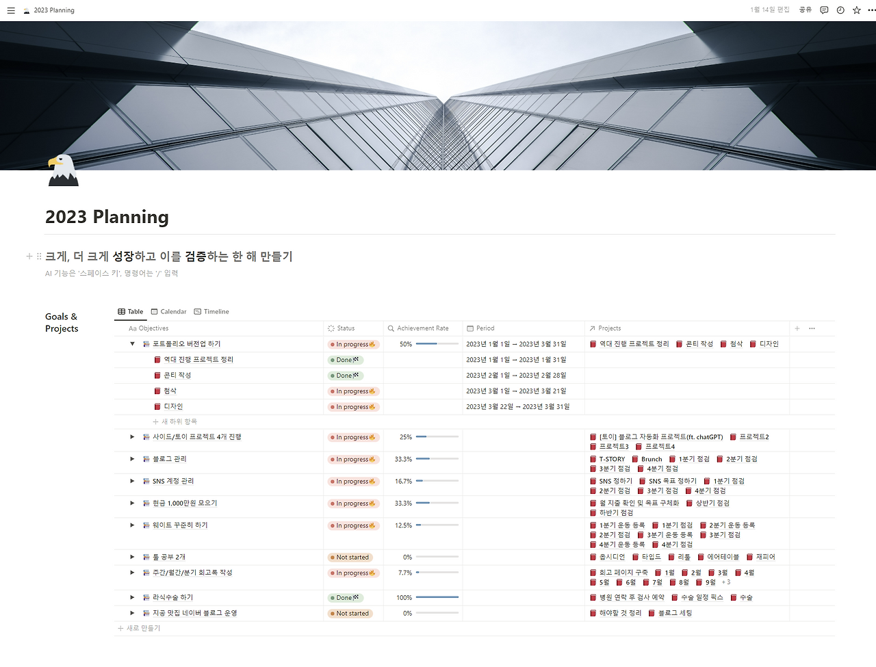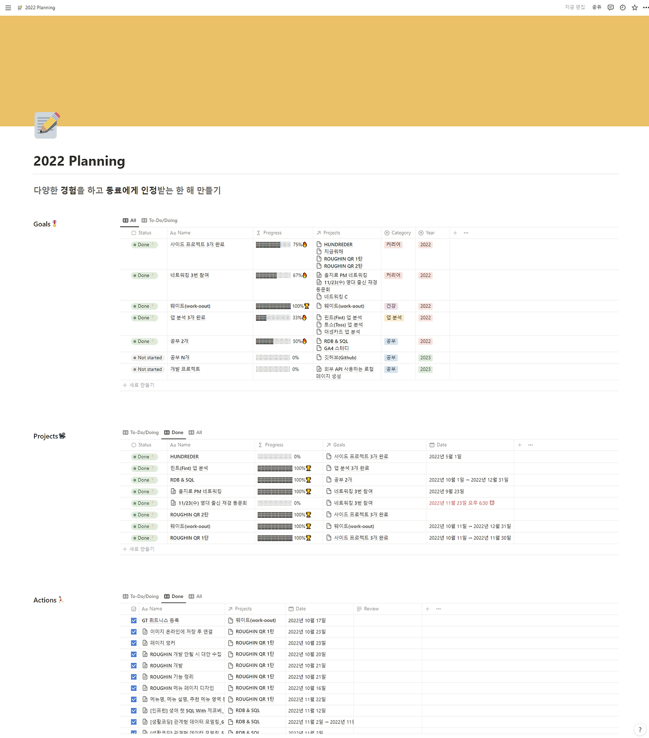 작년 하반기부터 연간계획을 노션으로 만들었으며 한 해의 목적과 목표를 관리하고 있다.작년 하반기부터 관리하기 시작했다.