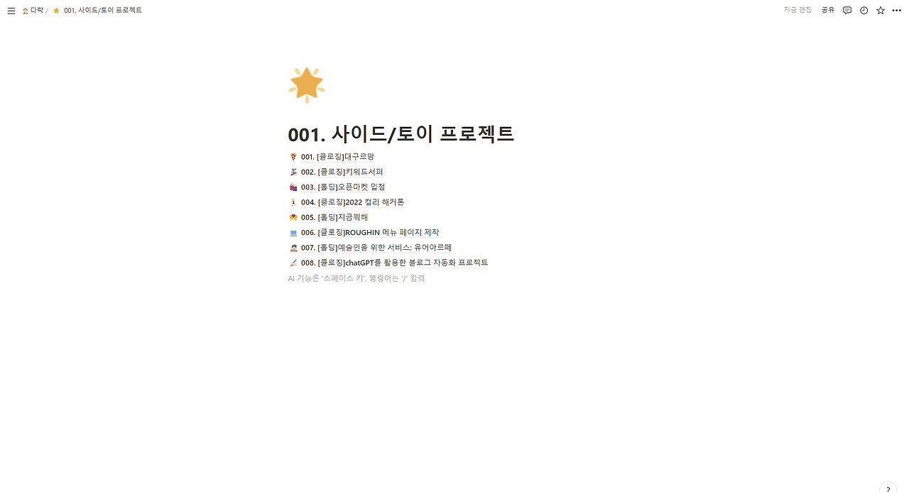 소소하게 주위 사람들과 다양한 사이드 프로젝트를 진행하곤 하는데, 이때 협업을 위한 공간으로 노션을 사용한다. 페이지에 게스트로 초대한 후 권한을 알맞게 부여해 주면 협업할 때 아주 편하다. 여기서 노션을 유료결제하면 게스트 초대 수 제한이 없어진다. 웹 공유로 편집 가능하게 열어줄 수도 있는데, 게스트로 작업하는 것이 더 편하다고 하더라. 아래는 사이드 프로젝트 관련 페이지와 예시.