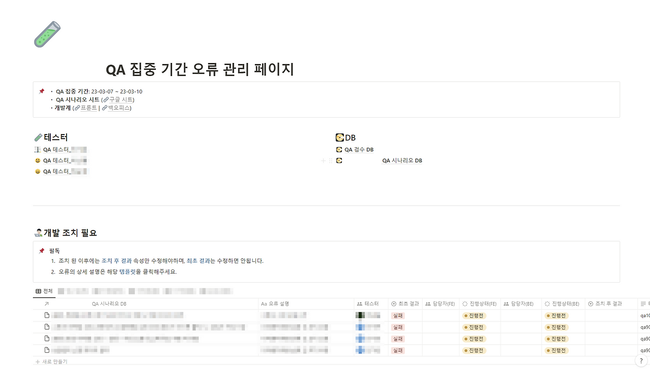결국 테스터들은 테스터 개인 페이지만 확인하면 되고, 개발자는 아래의 개발 조치 필요만 확인하면 되도록 해서 사용자가 해야 할 업무들을 영역(화면)별로 명확하게 구분 지었다.