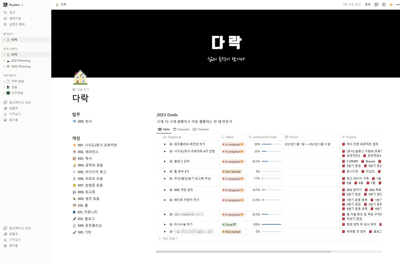 아래는 내 개인용 노션의 메인 워크스페이스, 다락이다. 사이드 메뉴에 보면 2022/2023 Planning이 따로 존재하는데, 연간계획 데이터베이스를 따로 관리하기 위해 분리한 것이다. 내 모든 활동은 다락을 거쳐 이루어진다. 연간계획은 내가 활동하는 것에 맞춰 수기로 업데이트를 해줘야 하기 때문에 다락에 표 보기로 가지고 왔다.