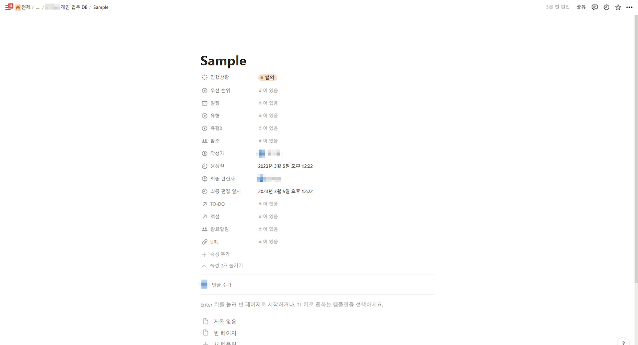 프로젝트 진행을 위해 기본적인 속성 정도는 육하원칙을 고려해 통일해 놓으면 좋다. 내 개인 페이지의 업무 DB를 만들 때 고려한 템플릿의 속성은 아래와 같다.