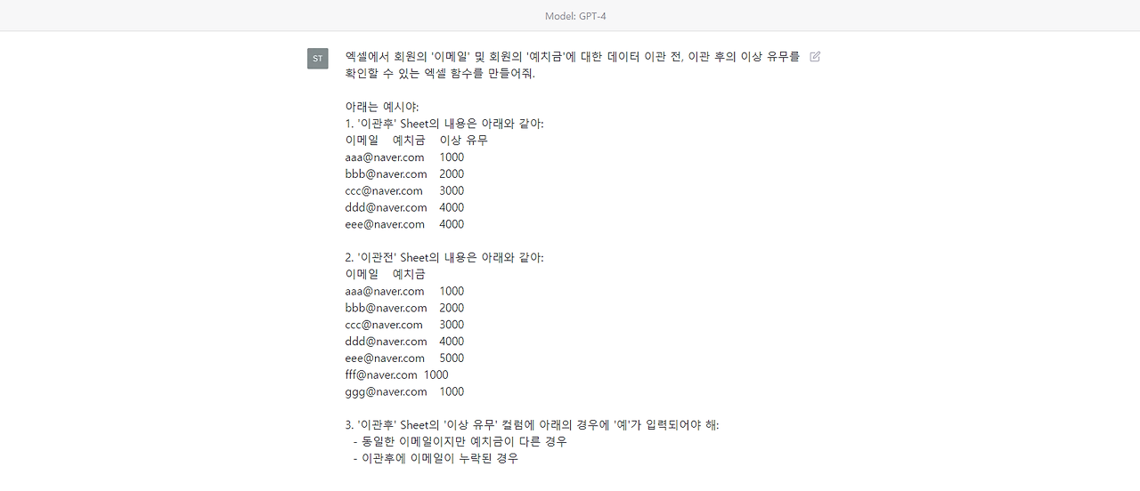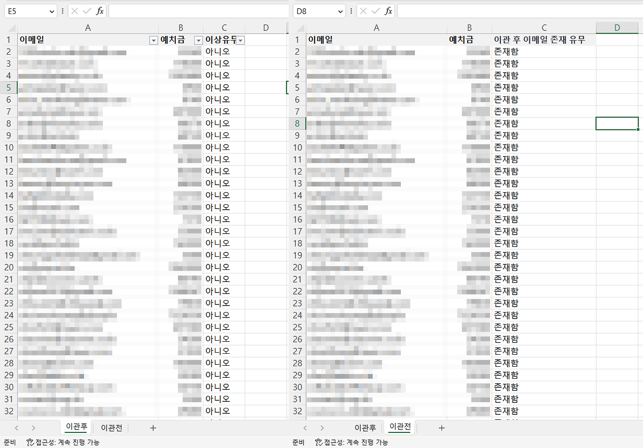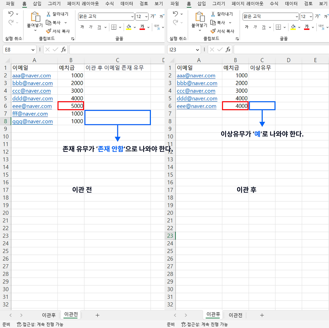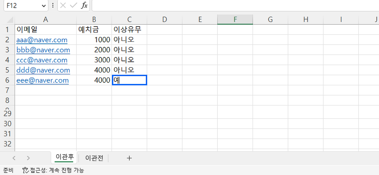 ‘이관전’ 시트에는 ‘eee@naver.com’ 이메일(계정)의 예치금을 5000으로 입력해 놨다. 따라서 'eee@naver.com' 계정은 '이관후' 시트에서 '이상유무'가 '예'로 나와야 한다.
