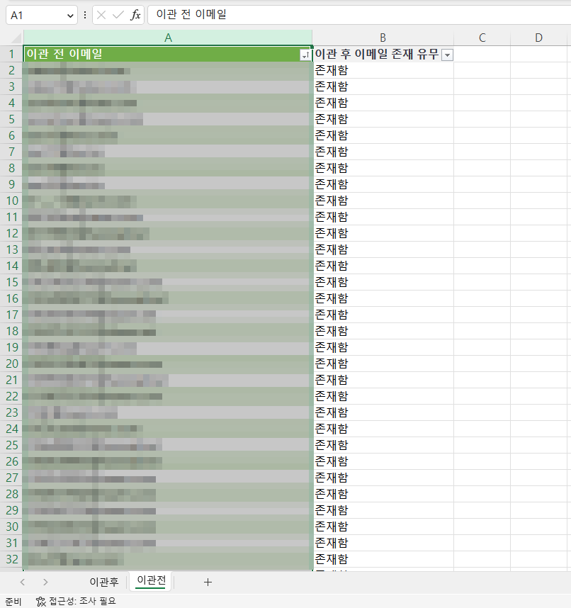 사실 중요한 검수 작업인 만큼 이관 후 이메일 존재 유무를 체크한 후 다른 검수 과정을 하나 더 거쳤지만, 우선 엑셀을 만든 목표는 달성했다.
