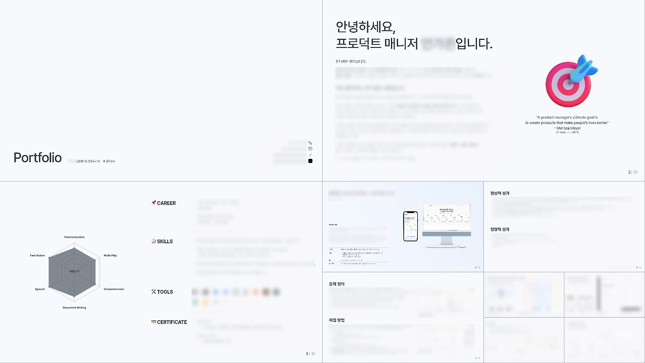 이번 포트폴리오 정리를 통해 내가 어떤 업무와 프로젝트를 진행했고, 어떤 레슨런을 가졌는지를 정리할 수 있어서 좋았다. 겸사겸사 혹시 모를 상황(?)을 대비할 수 있기도 했고. 사진은 PDF로 따로 만든 포트폴리오인데, 개인적으로 커피챗을 가지거나 보고 싶다고 하는 분들께만 전달하는 용도의 포폴이다. 오픈 포트폴리오는 노션에 만들어놨다.