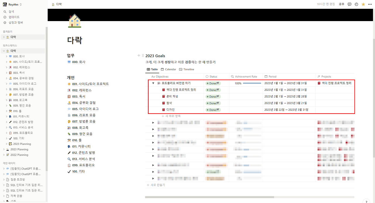 노션 개인페이지, '다락'의 목적목표 대시보드