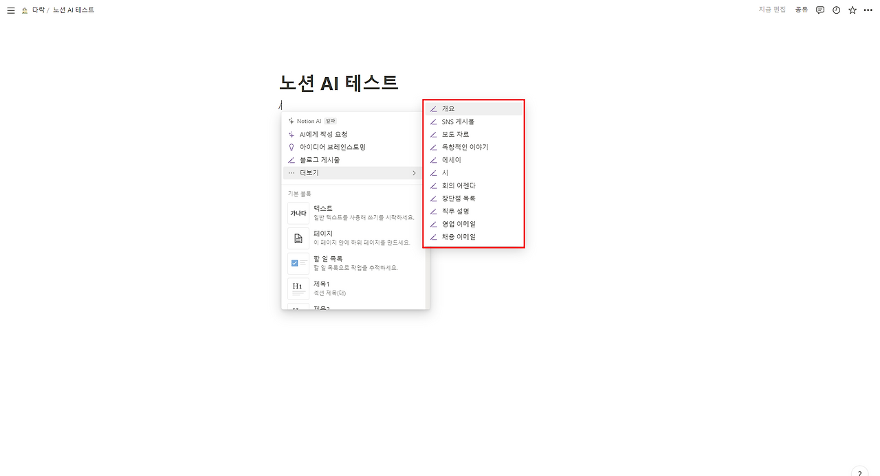 오랜만에 노션 AI를 사용하려고 리스트를 열어보니, 2주 전에 알파테스터가 막 되었을 때 보다 뭔가 기능이 더 추가되었다. 노션 AI 홈페이지에서 움짤로만 보이던 그런 기능들이었는데, 노션이 또 한국어에 강하기도 하니 한국의 AI 콘텐츠 생성 플랫폼 뤼튼이 떠오르기도 한다.
