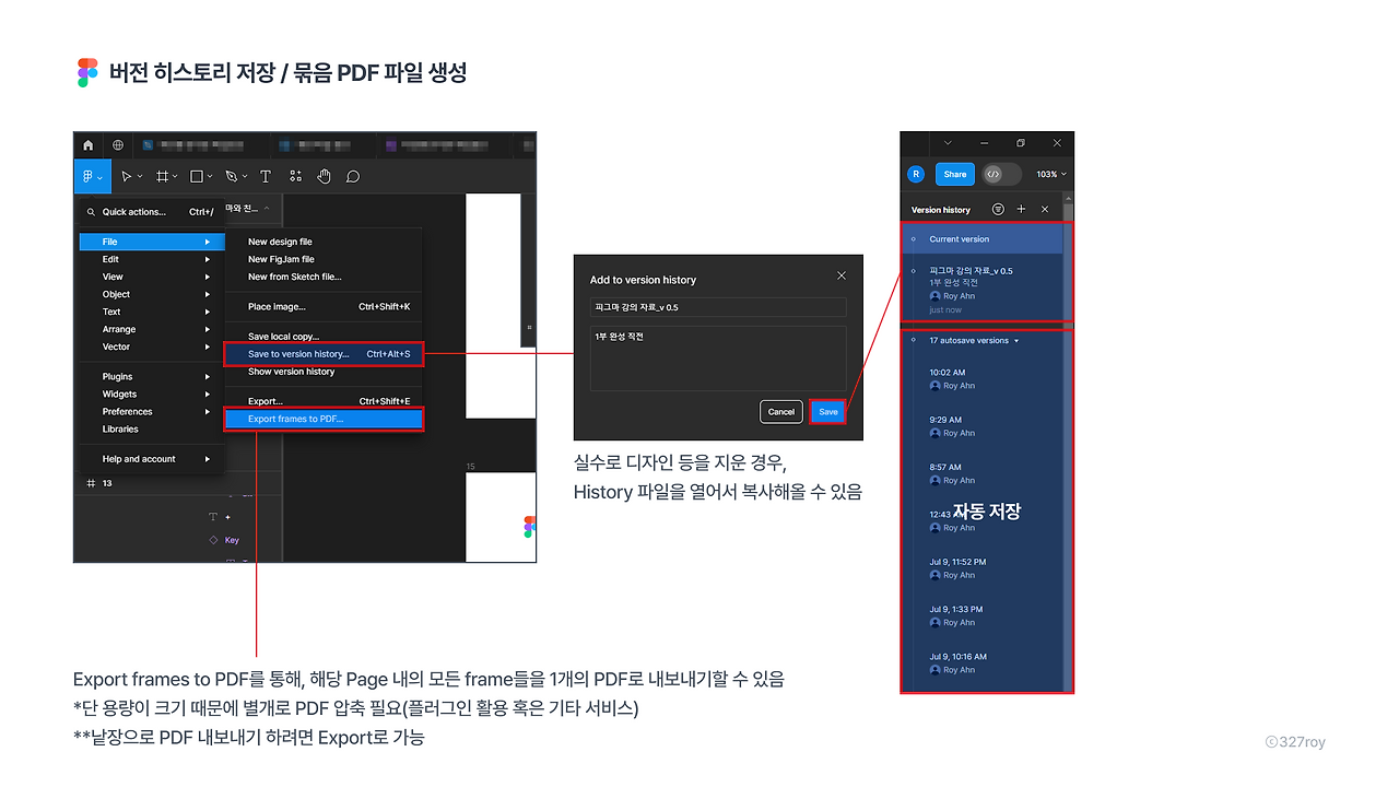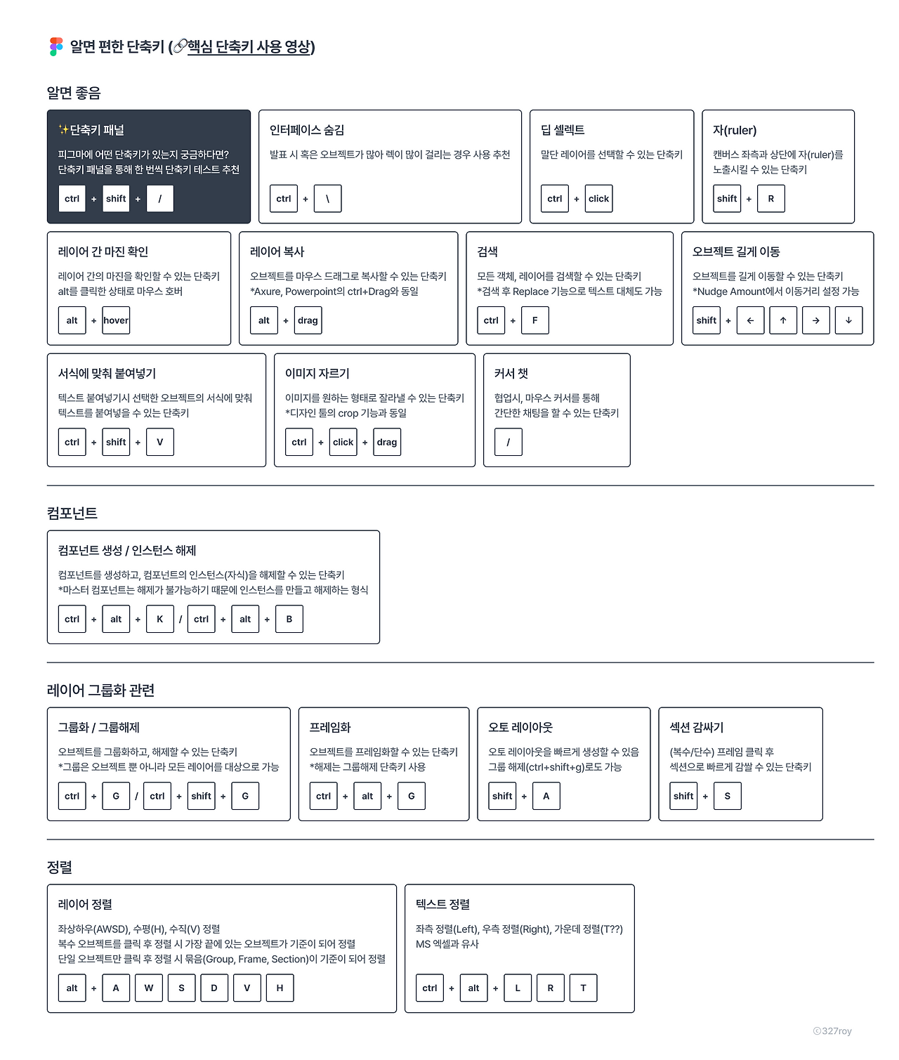 출력을 하거나 이미지 파일로 공유하고 싶다면 1) 피그마 파일에 접속한 후, 2) [알면 편한 단축키] 프레임을 복사하고 3) 자신 피그마 파일에 붙여넣은 후 4) PDF, PNG 등으로 Export 하면 된다.