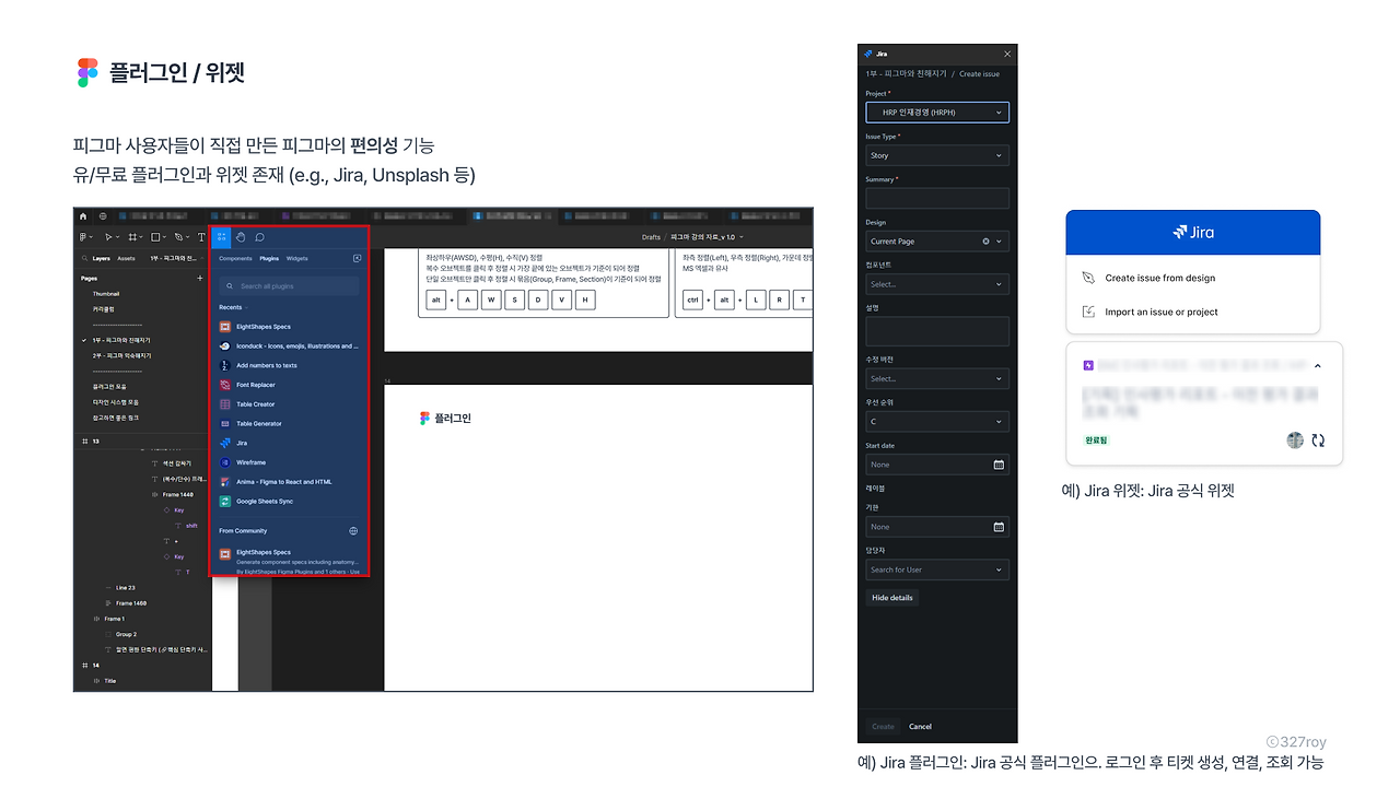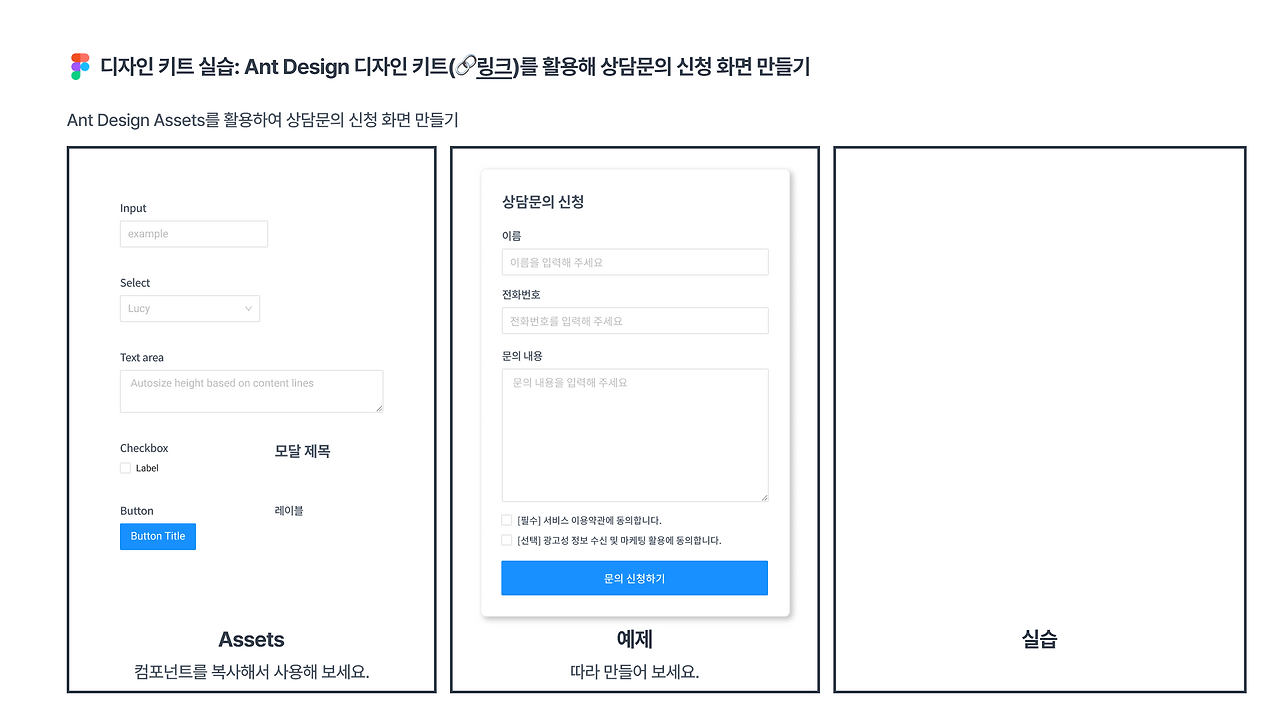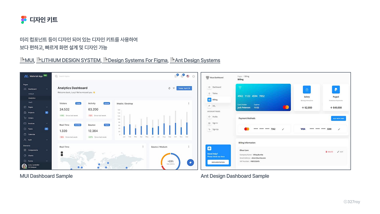 실제로 리액트 등에서 코드 Import 가능한 컴포넌트를 피그마 디자인 키트로 구현한 것들이 꽤 있다. 대표적으로 Ant Design과 MUI가 있다. 이를 통해 별다른 디자인 없이 개발 라이브러리에서 구현되는 컴포넌트와 동일한 디자인을 피그마에서 할 수 있다.