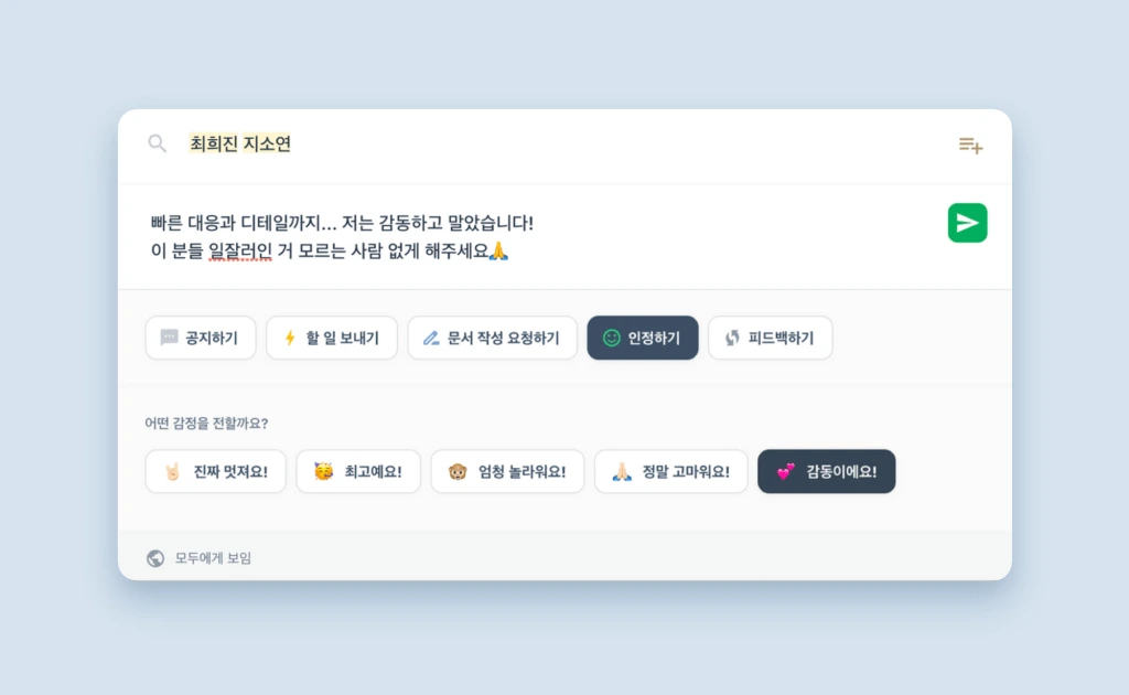 보통 외국의 성과관리 솔루션들을 보면 이런 것들을 Praise, Review, Feedback과 같은 기능으로 분리한 것도 많으니 참고하면 좋을 듯하다.