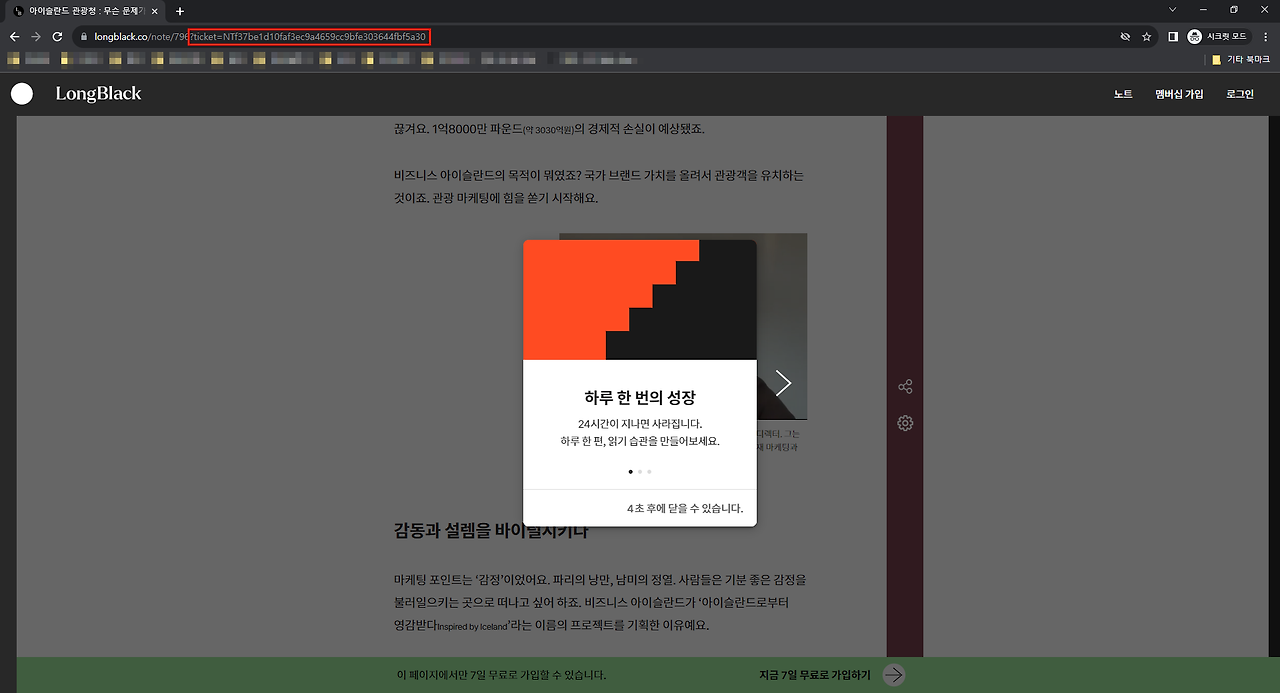 첨부한 URL을 보면 롱블랙 아티클 고유번호 뒤에 ?ticket=으로 시작하는 파라미터를 확인할 수 있다. 이 파라미터를 통해 접근 권한을 확인하는 것으로 추측된다.