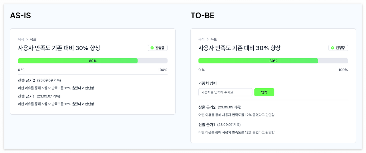 가령 '사람들이 자신의 목표를 작성할 수 있는 영역'과 '목표 달성률'을 입력할 수 있는 기능을 제공하며, 보다 정확하게 목표 달성률을 산출해 낼 수 있도록 사용자가 임의를 가중치를 곱하기 싶어 한다고 가정해 보자.